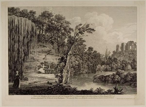 Curator: This is John Byrne’s "Matlock High Tor," showing the south view. The artist, born in 1786, captures a scene of serene beauty. Editor: The engraving’s monochromatic palette lends an air of classical restraint, doesn’t it? The composition—that dramatic cliff face contrasted with the calm river—it’s quite striking. Curator: The lone fisherman along the river evokes a sense of romantic solitude, almost a symbolic bridge between humanity and nature. Editor: Indeed, but the artist's use of line is especially notable. Notice how Byrne employs hatching and stippling to render form and texture? The result is a compelling play of light and shadow. Curator: And that particular juxtaposition of the human figure against the grandeur of the natural landscape reflects a very specific cultural fascination. It suggests a deep connection to the land. Editor: It brings to mind that landscapes such as these were very popular during the Picturesque movement. The dramatic contours, the sublime scale... Curator: True, it speaks to a longing for simplicity and a reverence for nature, themes that still resonate today. Editor: A thoughtful rendering, and beautifully constructed, even now.