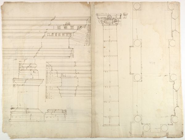 Curator: I find this architectural study from the Renaissance, rendered in pencil and etching, quite compelling in its austere beauty. This piece, likely created between 1500 and 1560 by an anonymous artist, meticulously depicts sections of the Arch of Septimius Severus. Editor: The precision is astonishing, like an exercise in pure geometrical relationships. And yet, looking at the frayed edges of the paper, the smudges, the thin lines... it feels incredibly fragile, almost as though the arch itself could crumble back into dust. Curator: Indeed. Consider how the artist deploys line weight and hatching to create depth, articulating the interplay of light and shadow across the arch’s entablature. The plan uses both pencil and etching to differentiate features, highlighting form, and emphasizing the solidity of each component. Editor: The choice to represent a Roman monument during the Renaissance is striking. The arch, erected to celebrate military victories, carries layers of Roman imperial iconography—power, conquest, divine favor—and, later, appropriation in the Renaissance, a culture seeking to adopt such grandeur. Note the use of vegetal elements combined with Roman imagery. Curator: The semiotics are layered, certainly. Each precisely drawn volute and carefully measured dimension signifies not only architectural accuracy but also a profound connection to classical ideals of beauty and order. Observe how these geometric forms carry echoes of the power structures from Imperial Rome. Editor: But that act of replication isn't neutral. To study and represent an arch dedicated to military triumph is to engage with, and perhaps legitimize, a specific model of leadership, violence and authority. It is the symbolic appropriation and adaptation by an emergent, centralizing cultural identity. Curator: Undoubtedly, the very act of redrawing speaks to the artist's engagement with, or critical assessment of, these power structures, manifested in stone, adapted onto paper, using drawing techniques to expose underlying geometrical forms. Editor: A fascinating reminder of how every line, every choice of medium, is charged with symbolic potential, turning even architectural documentation into a field of meaning. It seems even the ruins echo meaning. Curator: Absolutely. What starts as structural drawing evolves into a subtle symbolic commentary, illustrating our complex relationship with history and how we adapt the forms that it uses.