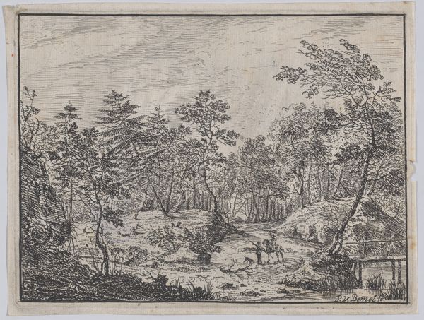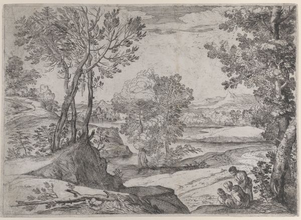 Editor: We're looking at Pieter Molyn the Elder’s “Baumpartie am Wasser, Leute sind auf dem Felde beschäftigt, links am Bach drei Angler” which roughly translates to "Trees by the Water, People are Busy in the Fields, Three Anglers on the Left by the Stream." It’s a delicate landscape drawing rendered in chalk, pencil, and ink. It feels almost like a snapshot of everyday life. What's your perspective on this work? Curator: Molyn presents us with a seemingly simple scene, but it is rich in the context of the Dutch Golden Age. Landscape paintings at this time were reflections of national identity. The Netherlands had recently gained independence, so depictions of their land became popular statements of pride. Notice the farmers, the anglers. What does that tell us? Editor: That their day to day lives and jobs were shown as pride-worthy? Curator: Exactly. Think about the intended audience. These works were bought by the rising middle class who were eager to establish and flaunt their newfound wealth and status. And through these images, they saw reflections of themselves and the values of their society. Does this change how you perceive the artwork now? Editor: Absolutely, what I took to be an unremarkable snapshot now feels very calculated and symbolic. It’s easy to overlook those societal elements. It speaks volumes about the power of representation. Thank you for showing me how to think critically about Dutch landscape painting! Curator: My pleasure! Remembering that art is always entwined with social and political circumstances allows for a deeper and fuller experience.