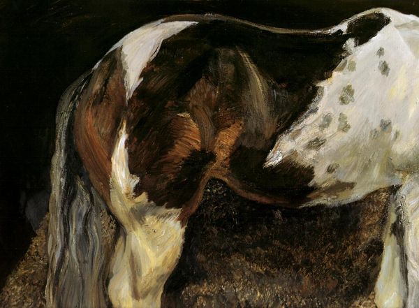 Curator: This oil painting, eloquently titled "Study of Pigs," captures a fascinating glimpse into, well, the material reality of animal husbandry. The artist is Alexandre-Gabriel Decamps. Editor: There's something strangely calming about it, even though it's, you know, pigs. The muted browns and grays sort of soften the whole experience, making it feel almost like a cozy, if earthy, daydream. Curator: Decamps clearly had an interest in animal subjects. These weren’t just livestock to him. The painting displays an observational practice rooted in depicting barnyard labor, farm economies, and what that meant for human-animal relations. Editor: It's interesting you say that. I'm noticing, the texture seems crucial here—the thick impasto strokes that describe the fur, the straw, even the mud...you can almost smell it, the whole organic shebang. Like, what does it *feel* like to touch that? Curator: That tactile quality really grounds the scene in the reality of 19th-century agricultural production. The way Decamps handles the oil paint gives form to the day-to-day processes and labor central to a farm’s maintenance and functionality. Editor: But, still, there’s an intimacy here that goes beyond mere documentation. It’s in the slumped posture of the sleeping pig, the way the other is so intensely focused on rooting around. They seem perfectly content and trusting in their little pen world, and they convey such innocence...do pigs feel the sublime? Curator: I don't know about the sublime. What's undeniable, though, is the artist's craft in conveying how the means of living impacts the existence and perception of these subjects, highlighting their social and economical roles. Editor: Alright, I admit I appreciate understanding Decamps' commentary on society reflected through animals, labor and so forth... But when I step back from that and I ask myself, what are those little porkers *thinking*? Okay, that's where the magic of art lives for me, a conversation that never stops. Curator: Perhaps a materialist reading also invites a broader social discussion – what purpose has art had throughout history? "Study of Pigs," in its realism and focus, can prompt reflections about those functions.