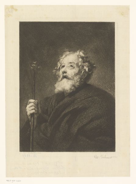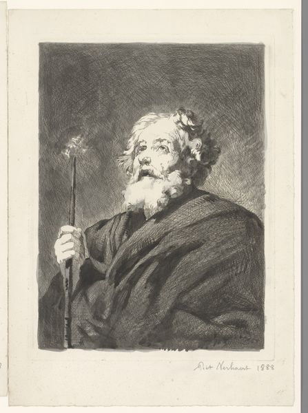 John Faber II created this mezzotint, "Oude man met boek," using a copper plate. Mezzotint is a printmaking process that relies on building up tones from dark to light. Think of it: the artist would have started with a roughened surface, achieved by systematically marking the plate with a tool called a rocker. This creates a burr that, if inked, would print solid black. From there, Faber would have burnished and scraped areas of the plate to varying degrees of smoothness, so they would hold less ink – creating the illusion of light. The velvety blacks and subtle gradations of tone are characteristic of this labor-intensive technique. Consider the cultural context. Printmaking in Faber's time was essential for disseminating images, acting as a kind of visual internet. This particular print, with its focus on an elder absorbed in learning, speaks to the value placed on knowledge and reflection during the Enlightenment. So, next time you see a print, remember the skill and labor involved in its making, and how that process connects it to wider social concerns.
