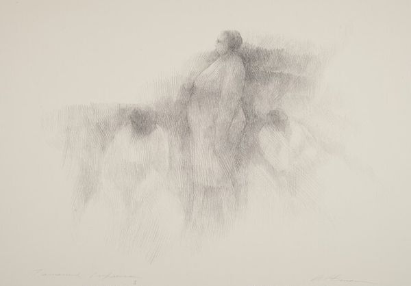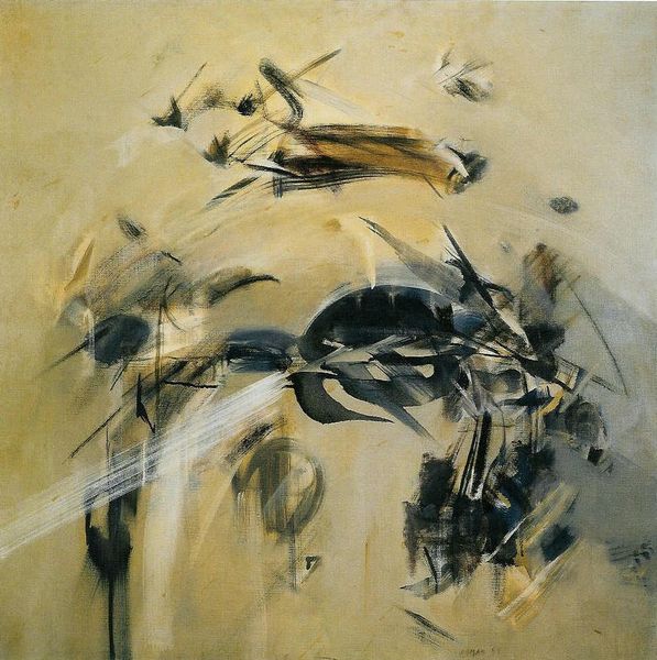 Curator: Here we have an untitled work by Rodolfo Arico, rendered in charcoal with touches of what appears to be gestural painting. It embodies the abstract expressionist style. Editor: It feels almost like a fleeting thought, doesn't it? The wisps of charcoal seem to dance on the canvas. I find the scale creates an intimate viewing experience, despite its abstraction. Curator: Arico’s work aligns with a broader mid-century push towards abstraction, reflecting a post-war societal shift away from prescribed narratives. Galleries championed such non-representational forms, positioning them as markers of cultural sophistication and progress. Editor: The composition is particularly striking. The contrast between the chaotic energy in the center and the quiet, almost blank surrounding space really pulls the eye. There is a real tension that emerges between what seems to emerge from the lines and what is left unfinished. Curator: The lack of a title reinforces this openness, this invitation for individual interpretation that defined the artistic climate of the time. Collectors prized owning a piece that defied easy categorization, mirroring a sense of personal liberation. Editor: True, and consider how Arico wields the charcoal—the pressure varies dramatically. At times it's a faint whisper; elsewhere, thick, almost sculptural marks carve into the surface. The materiality is itself incredibly expressive. Curator: Viewing it now, one can’t ignore the artwork's participation in shaping what was deemed 'avant-garde.' The artwork certainly made a statement about freedom of expression in a very divided world. Editor: Looking at this interplay of form and formlessness makes you really start to think about the artist's intent, if that is even something we can know for certain, I find myself constantly asking questions as I explore the work with my eyes. Curator: It's a testament to the ongoing dialogue between artwork and viewer, a key component of its lasting influence. Editor: A piece that rewards deep looking—I notice something new each time.