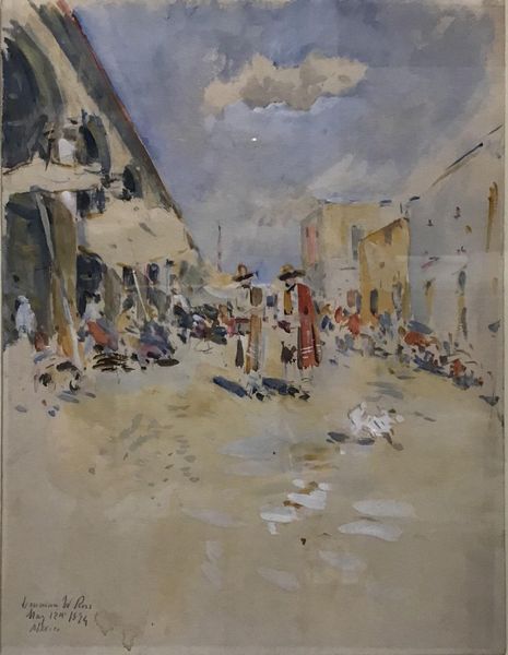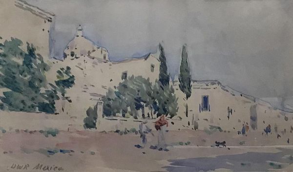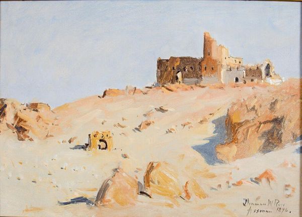 Editor: This watercolor, titled "Tomb at Assouan, Egypt," really captures a sense of decay and stillness. What symbols or meanings do you find particularly striking in this piece? Curator: The ruined structure, rendered in muted tones, immediately evokes a sense of temporal passage. Notice how the artist positions the figure in blue against this backdrop. What do you think that contrast might signify? Editor: Perhaps it's a reminder of human presence against the weight of history? Curator: Precisely. The blue figure, possibly a modern traveler, becomes a symbol of our ongoing engagement with the past and the cultural memory embedded within these ancient sites. The ruin is not merely a physical space but a repository of stories and experiences. Editor: That’s a great point. I now see how the artist uses color and form to bridge the gap between then and now. Curator: Indeed, it’s a delicate dance between presence and absence, memory and reality.