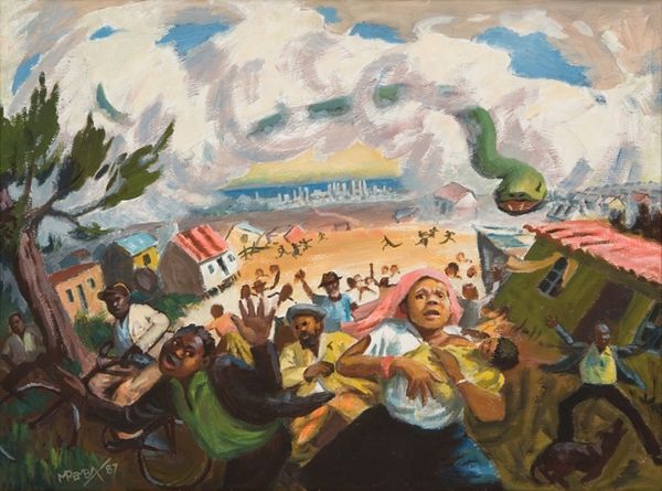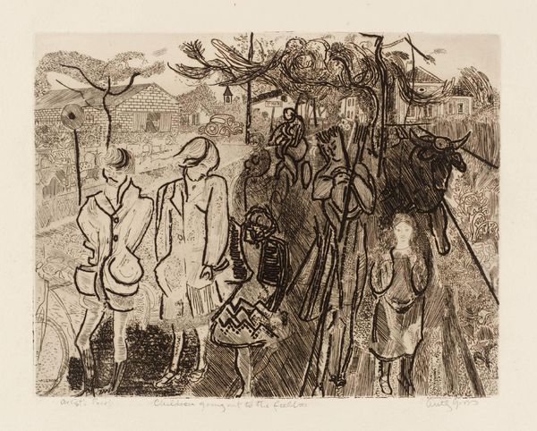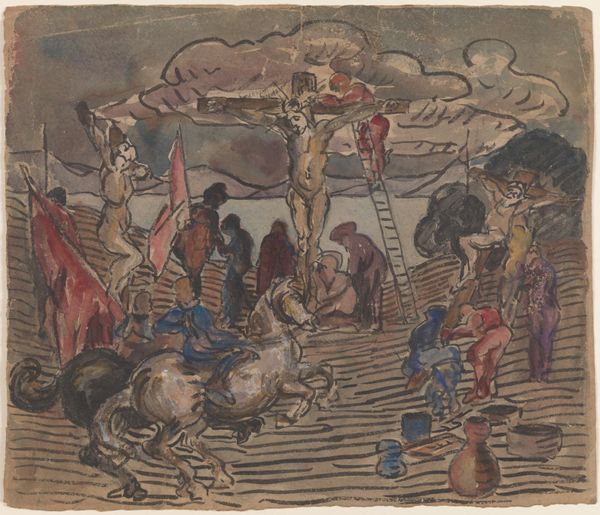 Editor: This watercolor painting is "Oogstende figuren" (Harvesting Figures) by Jacques Villon, from 1926. I’m struck by the energy in this composition. The figures are caught in this moment of labor, set against a landscape that almost vibrates with color. It feels like a slice of everyday life, but also monumental. How do you interpret this work? Curator: I see this painting as a social commentary veiled within an idyllic landscape. Consider the 1920s; this was a period marked by both post-war recovery and significant social stratification. Villon, as part of the Section d’Or, often engaged with cubist principles. We must ask: how does the fracturing and reassembling of figures and landscape reflect broader anxieties about social order and the individual's place within it? Editor: So, it’s more than just a picturesque scene? The fracturing makes it less romantic? Curator: Precisely! It acknowledges the realities of agricultural labor, the backbreaking work essential to societal sustenance, yet frequently unseen and unappreciated by the urban elite. The impressionistic style can be deceiving; while visually appealing, it prompts a conversation about labor's representation. Do you see a romantic celebration or something else? Editor: I think I was initially drawn in by the colours and the Impressionistic brushstrokes and assumed I was just enjoying the surface details, but considering it from a political and cultural view enriches my interpretation. Curator: Yes, it also serves as a visual reminder that art never exists in a vacuum; instead, it interacts with its cultural landscape. So much more to appreciate beyond surface value. Editor: This conversation has reshaped how I understand Jacques Villon, and the socio-political layers within a landscape painting, I will definitely view this through a different lens now. Curator: The layers are exactly what make it continue to draw the eye, it provides historical reflection which shapes and reshapes our perspective.
