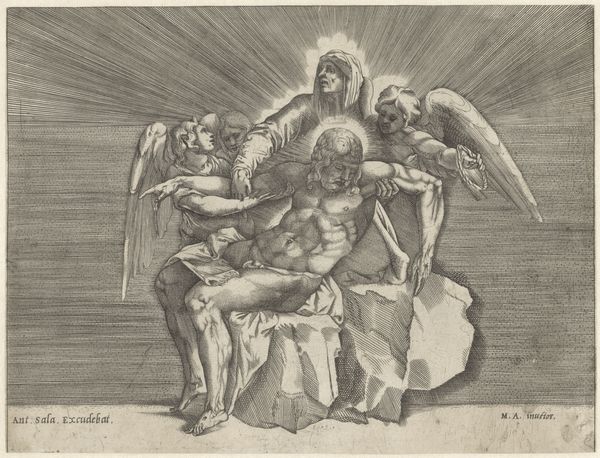 Curator: This is William Blake's watercolor, "And My Servant Job Shall Pray for You," part of his Illustrations to the Book of Job. Editor: The composition strikes me as deliberately archaic, like an illuminated manuscript. The stark figures and limited palette evoke a sense of profound solemnity. Curator: Blake was deeply engaged with the socio-political and religious turmoil of his time. Consider the dissenting views he expressed against institutional power and the Enlightenment through his unique, prophetic art. Editor: The elongated figures, typical of Blake, are not just aesthetic choices. They create a visual hierarchy, emphasizing Job’s spiritual authority and his connection to the divine. Curator: Indeed. The image resonates with the complexities of faith and forgiveness in times of suffering, reflecting Blake's own struggles with the religious establishment. Editor: A potent reminder of the power of visual form to convey moral and theological arguments. Curator: Precisely, it highlights the public role art can play in questioning prevailing values.