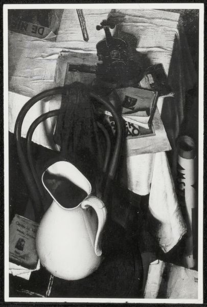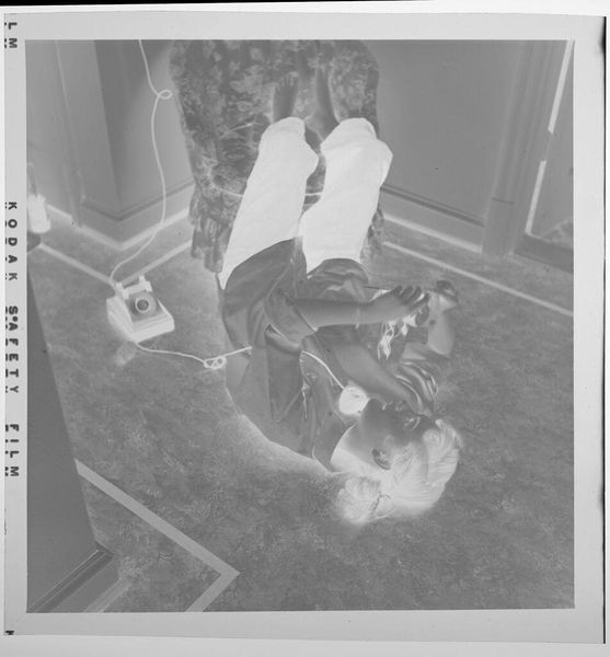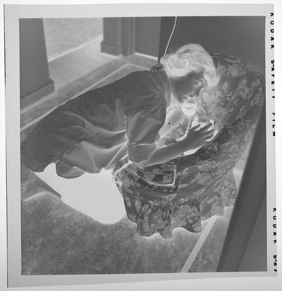 Curator: This small gelatin silver print by Jack Gould presents a candid, informal scene. It’s called "Untitled (girl lying on floor talking on telephone)." Editor: There’s a striking contrast between the softness of the figure and the harsh, graphic quality of the negative. It creates an unexpectedly intimate, almost voyeuristic mood. Curator: Absolutely, and consider the context: the girl's pose, the presence of the bottle and ashtray suggest a particular cultural moment, a casual domesticity enabled by postwar prosperity. Editor: And the composition, the horizontal plane broken by the diagonal of her body, leads the eye directly to the telephone, the focal point of connection and communication. Curator: The telephone itself is a key element, a technological artifact mediating relationships and shaping social interactions of the time. It’s worth questioning how we interact in domestic spaces. Editor: I agree. There is a lot to consider when looking at the objects in the photo, they lead to a better understanding of the period. Curator: A fascinating snapshot, indeed, prompting us to reconsider the material conditions of everyday life. Editor: I agree, it makes one consider the formal elements and what they imply.