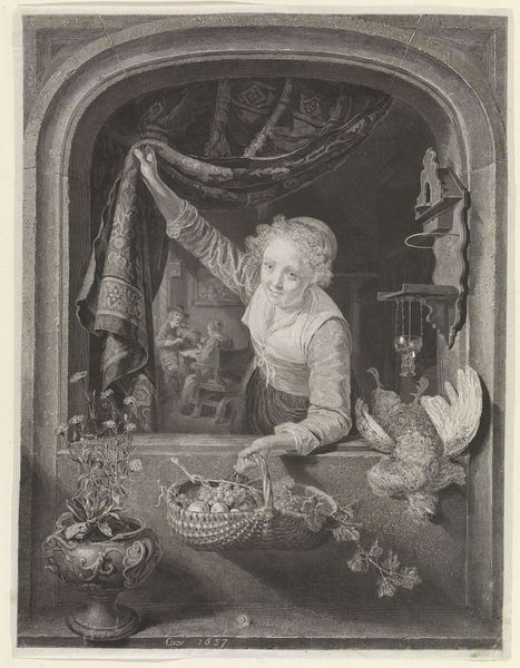 Domenicus van Tol's "Children with a Mousetrap" is an oil on canvas painting that offers a peek into 17th-century Dutch life. Van Tol's choice of oil paint allowed him to create a smooth, almost enameled surface, which helped to give the painting a realistic quality. The layering of oil paint permitted the subtle blending of colors, and the interplay of light and shadow, giving the image depth and volume. The mousetrap itself takes on a strange significance. Was it factory-made, or carefully constructed by a local craftsman? Either way, it would have been a valuable, and relatively expensive object in its time. The cat too, is a tool - a 'mouser', the children's plaything but also a domestic servant. This painting, with its quotidian subject matter and its intimate, domestic setting, blurred the lines between art and everyday life, and continues to offer insight into the social and material world of the Dutch Golden Age.