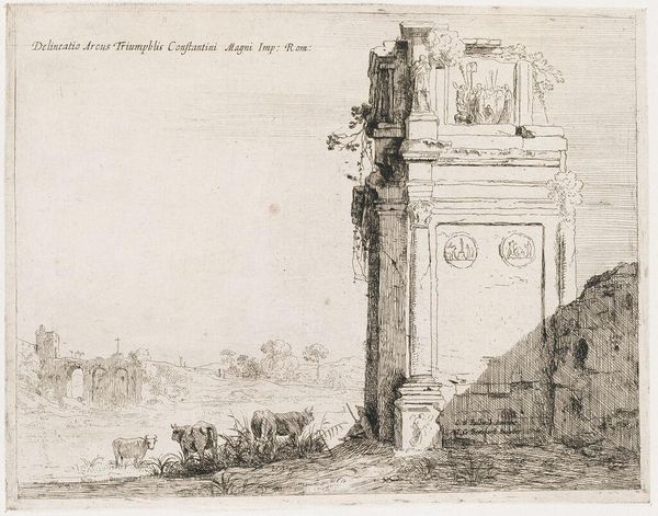 Editor: Here we have Jan Gerritsz van Bronckhorst's etching, "Ruïne van Boog van Constantijn te Rome," placing us somewhere between 1613 and 1661. The scene depicts the ruins of the Arch of Constantine amidst what looks like a pastoral landscape. It's striking how the remnants of imperial grandeur are juxtaposed with grazing cattle. What symbols stand out to you in this piece? Curator: The ruin itself, the Arch, isn't simply stone; it's a vessel teeming with cultural memory. It speaks of power, victory, and the once immutable nature of empires. Note how nature reclaims the space, vines crawling over carved stone. This echoes the ephemeral nature of human endeavors, set against the enduring backdrop of the natural world. Do you notice the oxen in the foreground? Editor: Yes, they seem oblivious to the historical weight of the arch. Curator: Precisely. They symbolize the continuation of life, agriculture, and a cyclical rhythm unaffected by the ambitions and collapses of empires. The figures in the roundels above seem eroded and lost, like figures from a fading dream, or half-remembered gods. What might that signify? Editor: Perhaps the loss of specific stories, a forgetting of the original purpose and details. It speaks to a broader amnesia. Curator: Consider the artist's choice to present the Arch as a ruin rather than in its former glory. This very act of choosing the ruin reframes the past. Bronckhorst prompts reflection on legacy and on what persists through time versus what is lost. How does the Baroque landscape around it contrast or complement the message in the triumphal arch itself? Editor: It creates a poignant contrast between human ambition and nature's indifference, reminding us that even the most powerful structures eventually crumble and return to the earth. I now understand that Bronckhorst uses imagery here not just to depict, but to convey complex layers of cultural and historical understanding. Curator: Indeed, and the Arch's continued presence, even in decay, speaks volumes about the enduring power of symbols to transmit ideas and emotions across generations. A ruin remains a cultural text.