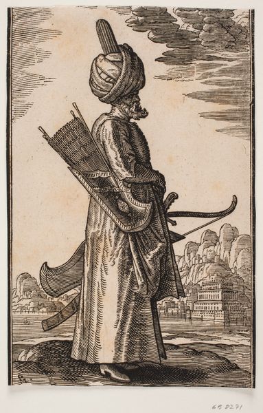 Editor: This is "Turban-clad rider with a sword at his right side and a war-club in his left hand, profile towards the right; in the background, an obelisk," created in 1582 by Melchior Lorck. It seems to be made with ink using the engraving technique. The detailed linework almost gives it the feeling of an architectural blueprint, although the subject matter is much more… organic. What are your initial thoughts on the formal elements here? Curator: Indeed. I am immediately drawn to the strong contrast between the tightly controlled, almost mechanical lines of the landscape and sky, versus the relatively more curvilinear and softer lines used to depict the rider, his horse, and their accoutrements. Note, also, how the obelisk in the background, a symbol of permanence, is rendered using similar lines to those that constitute the landscape. How does this influence our perception of its role? Editor: That's interesting. It creates a visual harmony, doesn’t it? Almost like the rider and his culture are a natural part of this landscape. But does the density of lines also play a part? The darker regions seem to delineate importance, giving form to the rider while simplifying the background to emphasize the central subject. Curator: Precisely. Lorck's choices here are not merely representational; they serve to guide the viewer’s eye and establish a hierarchy within the composition. Look at the diagonal lines across the sky versus the tightly woven detail of the horse’s harness. Do these textural differences influence our reading of the work? Editor: I think it makes me focus more on the textures and intricacies of the figure itself, which in turn highlight the exotic otherness of the man to his presumed European audience, which contrasts a bit with him feeling organic to the landscape as we initially thought. Curator: Well observed. I appreciate how attending to the textural details enriches the understanding of the artist's compositional strategy and possible intention. The sum becomes so much more than its individual elements. Editor: This was really interesting, and seeing it through a formal lens opened up a lot of possibilities. Thank you!