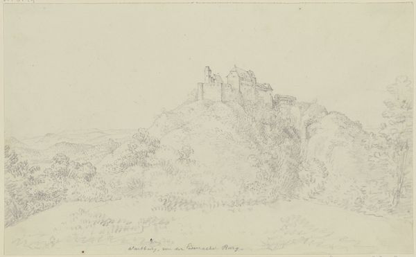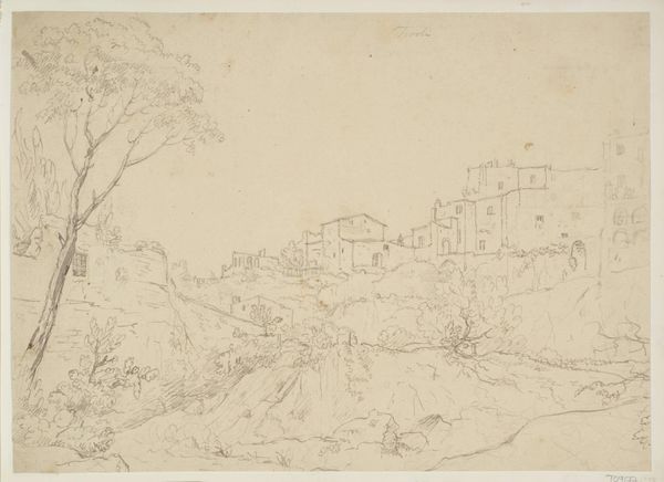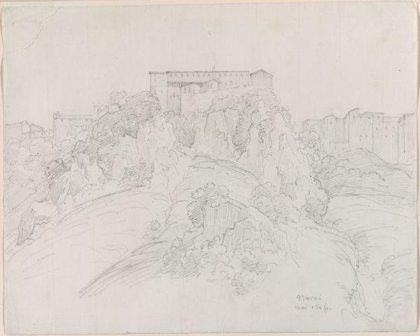 Editor: Here we have Corot's "View of Nepi," created around 1826 using pencil and graphite on paper. The delicate, almost ethereal quality of the light pencil work gives the landscape a dreamlike feeling. What strikes you most about this piece? Curator: It's precisely that delicate application of graphite that commands attention. Notice how Corot utilizes hatching and cross-hatching, not merely to describe form, but to modulate light itself. Do you see how the building seems almost to emerge from the very paper? Editor: Yes, it’s like he's building the town with light and shadow rather than lines. Is that why the forms below feel less defined, almost like suggestions? Curator: Precisely. This use of suggestion over explicit detail prompts us to consider the underlying structure. The contrast between the defined architectural forms above and the more ambiguous, almost amorphous, forms below creates a dynamic tension within the composition. What kind of rhythm do you notice? Editor: Well, my eye definitely jumps between the light, airy treatment of the base, and the heavy darks describing the buildings at the summit. It’s an upward progression, light to dark, vague to definite. Curator: An astute observation. Consider that the lack of clear tonal variation also serves to flatten the picture plane. Corot isn’t just representing Nepi, he is playing with the very conventions of representation itself. The work subverts your assumptions about realism by flattening space to create depth of focus. Editor: So it's a meditation on the process of seeing and rendering. It’s less about the specific location, and more about how we perceive landscape itself? Curator: Precisely. The very act of drawing is foregrounded. This interplay of light, shadow, and form truly exemplifies a sophisticated handling of line and perspective, wouldn't you agree? Editor: I see that now. I had initially dismissed it as just a preliminary sketch, but it is doing so much more by questioning what a sketch can achieve. Curator: Indeed. It allows for greater study on Corot’s technique, inviting the observer to reconsider established traditions through engagement.