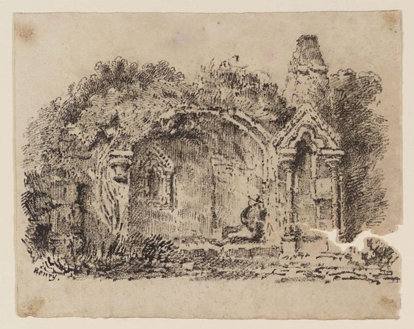 Editor: Here we have Anthonie van den Bos's "View of the Ruins of Brederode," a print etched sometime between 1773 and 1838. I find the ruin itself captivating, a stark testament against the surrounding pastoral landscape. What strikes you most about this piece? Curator: The ruin's existence isn’t accidental; its very form as an etching—a repeatable, reproducible medium— speaks to its function. Consider how the etcher painstakingly renders each stone, each line conveying the texture of the aged material. This labor transforms the ruins into a commodity, an object to be circulated and consumed by a specific viewership. Editor: A commodity? I hadn't considered that angle. You mean the process transforms it into an item for, like, romantic contemplation? Curator: Precisely. And for a burgeoning art market, no less. The artist invests their labor, etching away at the plate to capture not just the image, but also the implied history, loss, and the sublimity of the decaying structure. Think about the availability of the original raw materials - what stones were used and why - and who decided to spend the funds on building this structure, only for it to decay like this later? Editor: So, it's not just about the aesthetics of the ruin, but the whole social process of creating and consuming its image? Curator: Absolutely! It encourages us to contemplate not only the aesthetics, but also who benefits, the type of labor required for production, and the markets involved in circulating such imagery. Editor: That's fascinating. I’ll never look at landscape etchings the same way again. Thank you for elaborating. Curator: And I have enjoyed thinking with you about how this landscape as image depends on materiality and markets as much as atmosphere and romantic feeling!