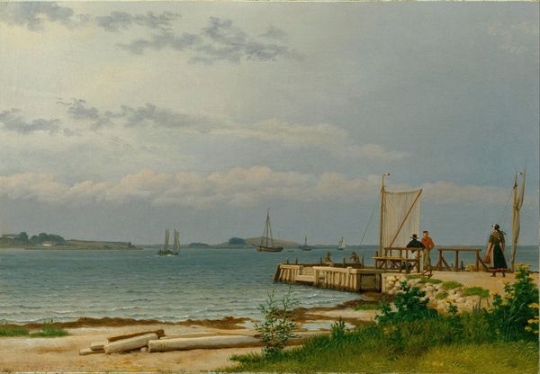 Curator: What a peaceful scene. It really evokes a sense of tranquility, doesn't it? The vast expanse of the sky meeting the gentle curve of the beach, with those figures almost blending into the landscape...it's all rather calming. Editor: Absolutely. Let’s delve into this artwork. This is "View of the Beach at Beverly, Massachusetts." It is by John Frederick Kensett, an artist known for his contributions to the Hudson River School, specifically the Luminist style. He favored serene coastal scenes. Curator: Hudson River School is apt; I definitely see that focus on landscape, on this interplay between light and the water. The composition itself almost feels like it invites a meditation on the environment. I wonder how Kensett thought about depicting leisure in the burgeoning industrial era, with some possibly forced, leisure activities for factory workers. Editor: That’s a crucial question, framing it in its historical moment. These landscapes became increasingly popular in an urbanizing America. There’s this tension between industrial progress and nostalgia for an idealized nature, as well as concerns of racial identity for workers in this movement that you highlighted. He often painted scenes accessible by newly constructed railroads, democratizing access to these landscapes while subtly reinforcing certain class dynamics, what with leisure time and where and how people would vacation. The painting becomes a symbol of what America aspired to be and what it tried to deny. Curator: And even the way he depicts the light, it's almost as if the scene is being cleansed. Is Kensett's emphasis on detail here an implicit commentary on class mobility through the idealisation of landscape? How are women reflected? Were there beach holidays during this era in England, and who took them? So much to impact it all. Editor: His work also reveals changing environmental perceptions during this time. Early American landscape painting served to rationalize and endorse colonial expansion; here Kensett uses some artistic agency in a new age, painting a more mature scene that reflects a more modern environment for his characters. There’s that suggestion of the relationship between humans and their environment – perhaps suggesting more caution and preservation is necessary than has occurred in prior landscape paintings. Curator: Food for thought; this work does open up numerous interesting discussions. Thank you for sharing those key details that deepen our reading. Editor: It's been a pleasure. These layers certainly give this piece significance and continue to speak to present realities, particularly our relationship with nature.