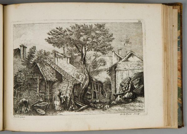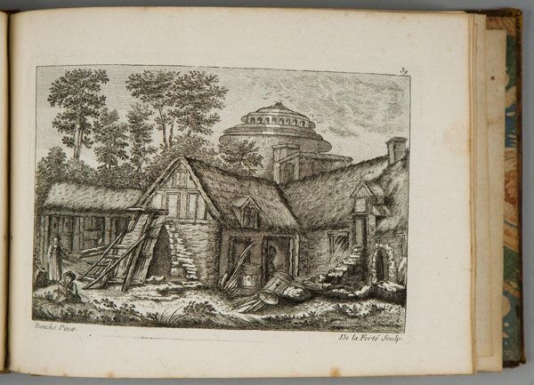 Curator: The image before us is titled "Sheperdess and Flock in Front of Thatched Barn," an etching by Denis-Pierre-Jean Papillon de la Ferté. Editor: There's a peacefulness to it, almost melancholic. The tiny figure and the flock seem dwarfed by the rustic barn and brooding trees. Curator: It's interesting you say that. These pastoral scenes were incredibly popular, often idealized visions of rural life enjoyed by city dwellers. Editor: Perhaps, but the starkness of the etching, the unadorned barn… It feels less like a romantic fantasy and more like a glimpse of actual hardscrabble existence. Curator: Possibly. But the image also participates in broader visual discourses around agriculture, class, and social organization in the 18th century, reflecting a time of significant socio-political tension. Editor: I can see that, definitely. It's got me wondering about the real lives behind such imagery. Curator: It makes you wonder, doesn't it?