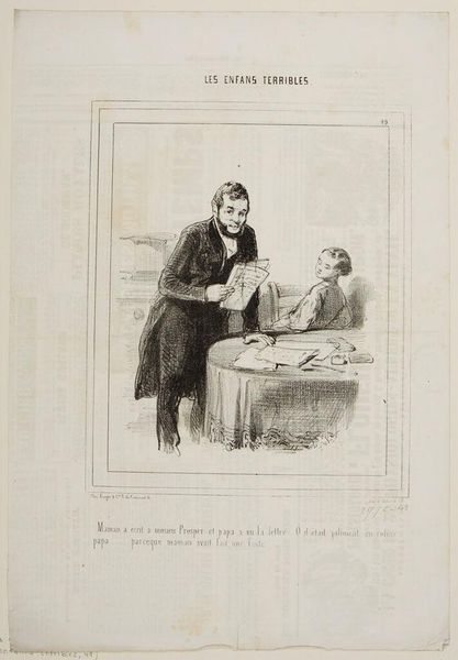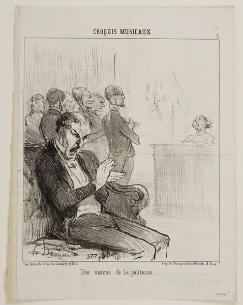 Curator: This is an intriguing lithograph by Honoré Daumier, titled "Draw nigh, M. Gérenflot...come to receive the crown of distinction for your good work against poverty..." Editor: The crown looks like a hairpiece, something hastily made. The recipient bows low, almost comical, under its implied weight, and the onlookers seem… skeptical? Curator: Daumier’s critical eye is definitely at play here. The print suggests a performative aspect to charity, highlighting the social currency someone might gain from "combating" poverty. Editor: Exactly! Notice the lithographic process, how Daumier uses line and shading to construct not just forms but also to layer in social commentary, implying that this "good work" is actually…well…not so good. The print itself, being a mass-produced object, critiques the commodification of charity. Curator: I sense that sardonic wit so peculiar to Daumier, that sharp observation of the human condition, where pride and pretense meet reality. Editor: Agreed. And I think examining the materiality reveals the socio-economic realities of 19th-century France and its own poverty.