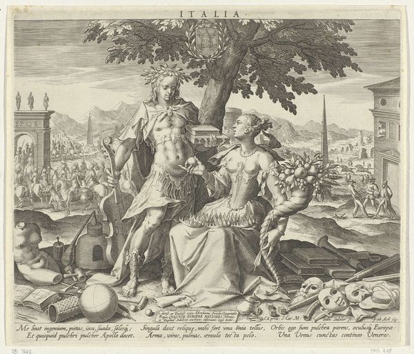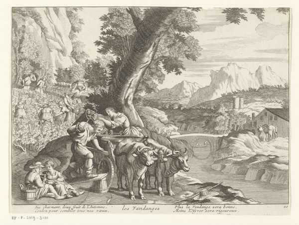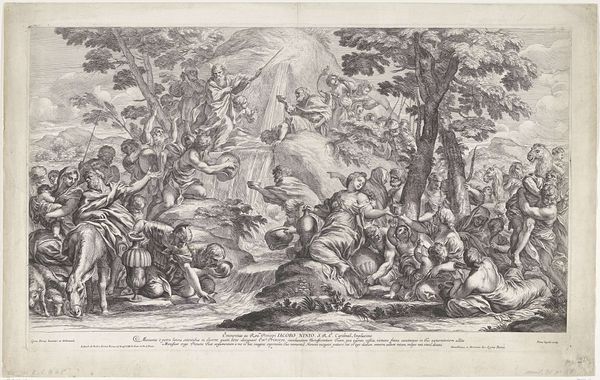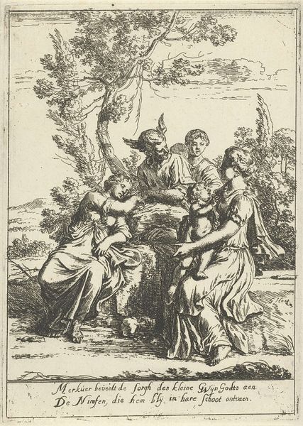 Curator: This is an engraving called "Vertumnus and Pomona" crafted sometime between 1670 and 1697. Its creator is Paul van Somer II, and here at the Rijksmuseum, it never fails to attract interest. What's your take on it? Editor: My first thought? Utter delight! It has an energy that makes you smile. Curator: Let's get a bit deeper. Notice the careful detail of the baroque style, filled with movement, energy and dynamism, a bit different to the classical style, and especially its complex composition, a semiotic field for careful engagement. How might you see it? Editor: Baroque… right. To me, it's all about the swirling energy. Look at all those cherubs buzzing around! They seem intent on creating a feeling of lighthearted chaos, as though trying to draw our attention. Curator: They’re certainly key to understanding this allegory of love, from Ovid’s Metamorphoses: Vertumnus, the god of seasons, is trying to woo Pomona, goddess of orchards, by disguising himself as an old woman, it is about persuasion and revelation. Editor: It makes me reflect about all those efforts one may devote in pursuing his goals in life and the disguises people adopt! The garden they are in itself feels dreamlike. And what's the role of that peacock? It's looking in our general direction like guarding those events. Curator: That bird certainly stands as an emblem of beauty. As an emblem of beauty, and maybe also a subtle pointer toward royalty. Its presence accentuates that sensation, maybe drawing a connection between divine love and earthly nobility. What lasting feelings emerge? Editor: After delving in? Just warmth and whimsy; the magic those clever engravers could create still makes the imagination soar centuries after it first took shape. Curator: Indeed! May we all, like Vertumnus, possess the skill to see beyond first glances and to understand hidden depths, both in art and, possibly, in life.
