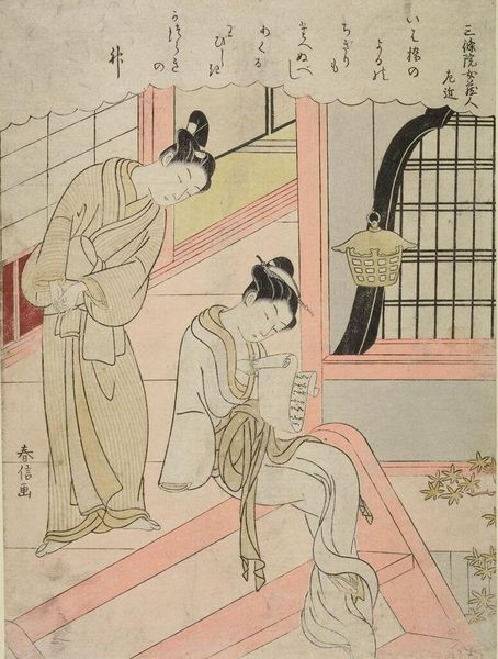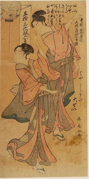 Editor: Here we have "Calendar: Selling Fans," a print by Suzuki Harunobu. The figures almost seem to float on the paper, and there’s a dreamlike quality to the scene. What catches your eye about this work? Curator: It feels like a fleeting moment, doesn't it? Harunobu has this incredible knack for capturing the ephemeral. Those young boys reaching, the woman’s gentle gaze… it's all so delicate. I wonder if it reminds you of a memory? Editor: It does! It makes me think of chasing after bubbles as a kid. Curator: Exactly! And those fans aren’t just fans; they’re calendars, markers of time passing. So, what at first seems like a simple street scene actually speaks to something much deeper, a gentle meditation on time and beauty. It’s quite poignant, isn’t it? Editor: Definitely, I hadn't thought of it that way. Thanks for sharing your thoughts.