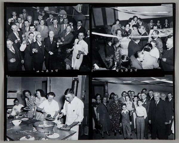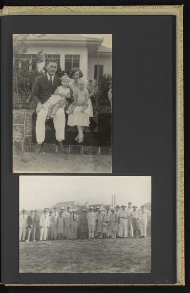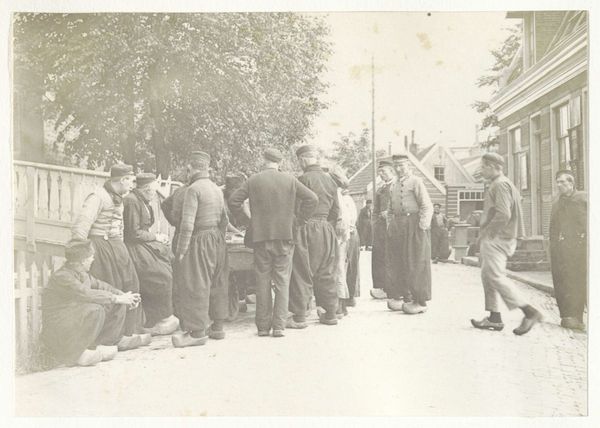 E. de Vries captured a group of Ambonese men in a photograph, whose dimensions are 18 by 24 centimeters. The composition is defined by a structured gathering of figures against a brick building, creating a dense yet organized visual field. The monochromatic palette emphasizes the textures of the various fabrics and the rough materiality of the brickwork. The formal arrangement of the subjects—some standing on steps, others on the ground—introduces a dynamic spatial hierarchy. This deliberate structuring of the group can be interpreted through the lens of social dynamics, suggesting ideas of community and collective identity. The waving gestures punctuate the scene with a sense of vibrancy and engagement. Note how the stark contrast and composition of the photograph captures a moment laden with unspoken narratives. This still image offers a rich ground for exploring themes of representation and belonging.