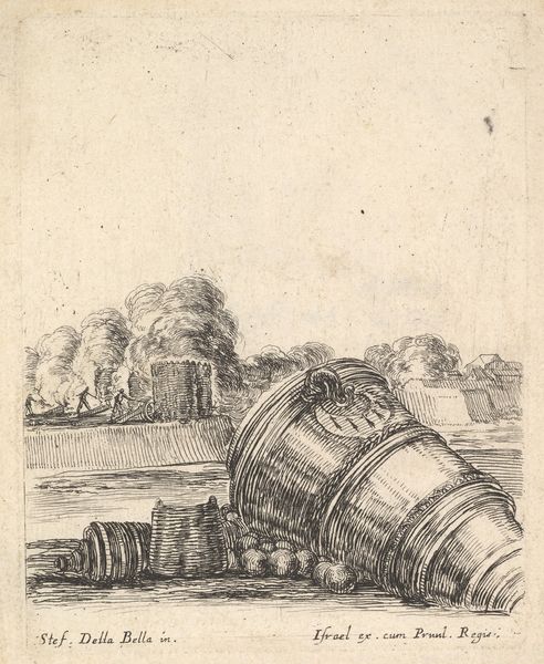 Curator: Look at this image: Stefano della Bella’s print from his 'Equipment needed for Fortification', dating from around 1638-1643. It presents a scene with cannons and soldiers. It’s currently held at the Metropolitan Museum of Art. Editor: The piece is surprisingly unsettling, isn’t it? Despite the seemingly straightforward depiction of military equipment, the stark lines and almost sterile composition evoke a feeling of coldness and strategic detachment. Curator: Indeed. Let's unpack this further. This was part of a series, so we must consider it within a larger political and military landscape. Remember the Thirty Years' War was raging at the time. Such prints served both as records of technological advancements in warfare and as tools of propaganda and potentially resistance too. Editor: It raises interesting questions about visibility, particularly concerning identity and labor during war. The focus is heavily on the cannons, making the soldiers feel secondary to the mechanisms of warfare itself. We barely see their faces, which diminishes their individual identities to that of war object. It prompts a discussion about the impact of military infrastructure on lived realities. Curator: Exactly! And let's think about the baroque context. While it may seem devoid of overt emotion, the print reveals the intricate details of military technology, emphasizing control, order, and a sense of calculated dominance - ideas that underpinned much of the political thought of that era. Editor: It serves as a chilling reminder that even in the realm of "objective" documentation, ideology finds a way to seep through. We are never just looking at equipment, but power dynamics, social values, and human impacts that are inherent and encoded. Curator: A fine point. Studying it in the museum today underscores the importance of critically examining these images. To consider not only their artistic value, but their active contribution to constructing a specific historical understanding. Editor: Well, this makes me think we should spend much more time evaluating these historical echoes and reverberations today. This small artwork is so telling.