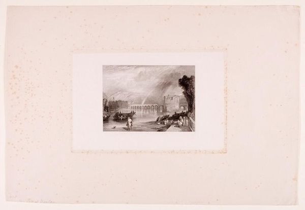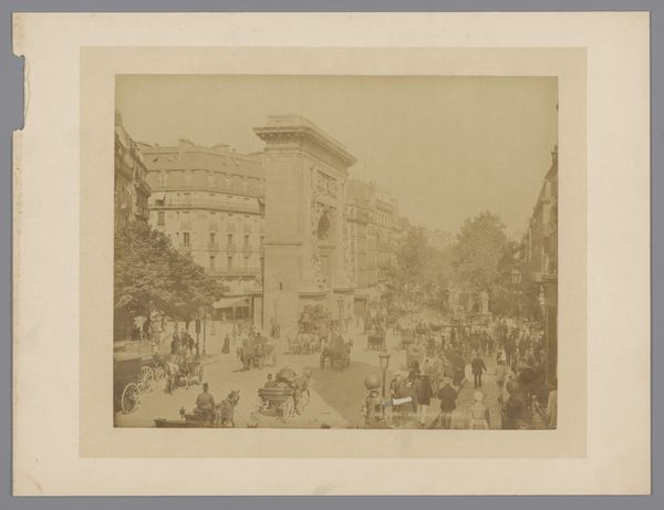 Curator: Thomas Higham’s print, titled *Boulevards, Paris*, captures the vibrant energy of Parisian life. Its composition is quite striking, don't you think? Editor: It does, but I am struck by its overall festive mood. It feels almost like a staged spectacle, with the balloon floating above as a symbol of aspiration or perhaps escape. Curator: I see your point. Focusing on its formal elements, the delicate etching technique employed by Higham really highlights the architectural details and the bustling crowd. The linear perspective is also cleverly used, drawing the eye deep into the scene. Editor: Yes, and that central tree… It acts as a visual anchor, yet it also feels like a marker of nature's presence amid the urban sprawl. Trees as markers of culture. Curator: I find the buildings to be incredibly intentional, and they establish a nice visual rhythm, almost like musical notation across the pictorial plane. Editor: Ultimately, the image preserves a moment in time, imbued with the aspirations and realities of a city on the rise. Curator: Indeed. It’s a fascinating study in textures and tones, offering a rich tapestry of Parisian life.