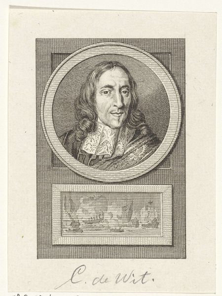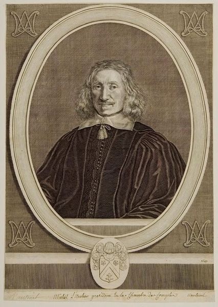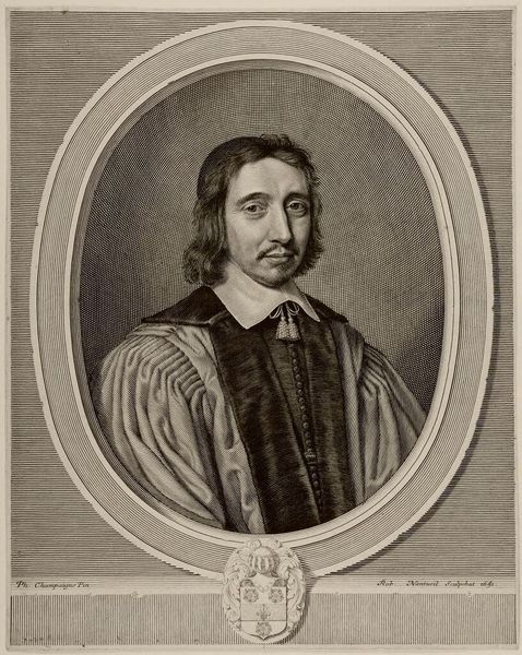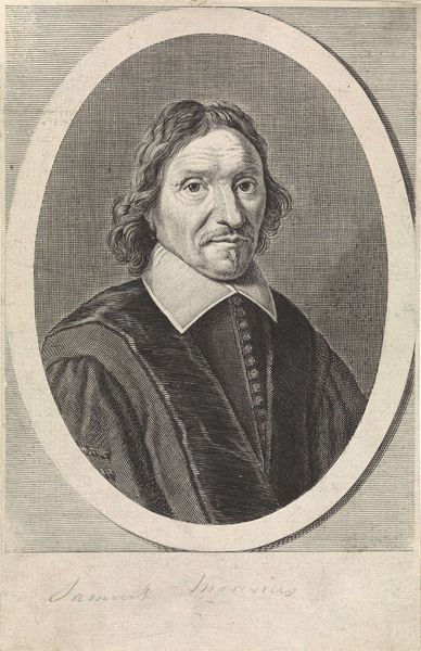 Theodor Matham created this portrait of Jacob Adriaensz. Backer, held at the Rijksmuseum, through engraving, a process that intricately marries form and content. Notice how Matham uses the oval frame not just as a boundary but as a compositional element that softens the geometric rigidity, contrasting with the sharp, precise lines that define Backer’s features and attire. This contrast draws our eye, inviting a closer look at Backer’s expression and the folds of his clothing, rendered with remarkable detail through the strategic use of hatching and cross-hatching. The choice of engraving is crucial; the stark black lines against the white paper evoke a sense of clarity and intellectual rigor, fitting for a portrait intended to memorialize a celebrated painter. The medium itself, with its capacity for fine detail, allows Matham to capture not just the likeness but perhaps also the essence of Backer’s artistic sensibility. Consider how this meticulous rendering contributes to the artwork's function as a statement about representation and artistic identity. The portrait, through its formal qualities, reflects broader cultural values around skill, precision, and the lasting impact of artistic achievement.