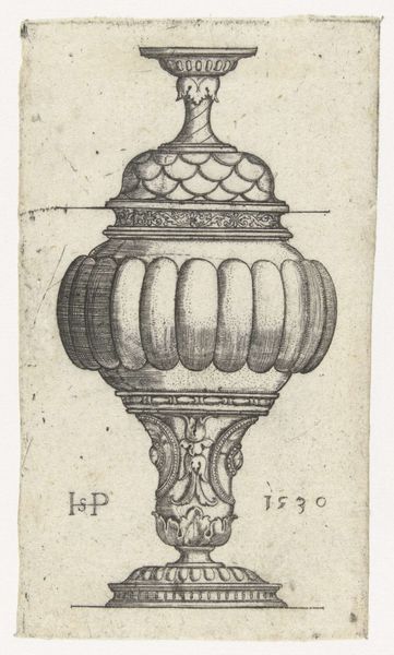 Hieronymus Hopfer created this print titled ‘Double Cup’ using etching. The print’s neutral palette allows us to focus on the composition and linear details. The cup's structure, with its symmetrical design, divides into distinct horizontal sections, creating a sense of balance. Each segment, adorned with bulbous shapes, suggests both a sense of organic growth and structured artifice. The fine lines, precisely etched, define the form and give texture, indicating a metallic quality to the cup. Note the repetitive patterns and the ornamental flourishes, like the small scrolls, which add layers of visual complexity. This piece reflects the Renaissance interest in classical forms and the period’s decorative arts. Hopfer’s etching uses a semiotic system where the cup signifies wealth, status, and the aesthetics of the era. The double cup design could reflect the idea of abundance, and the period's fascination with symmetry and order. Consider the cup's construction; it embodies cultural values and the aspirations of its time. The piece reminds us that even functional objects can serve as vehicles for cultural expression and meaning.