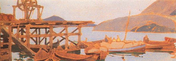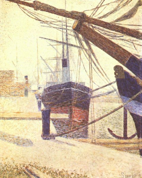 Editor: So, this is Francis Davis Millet's *Lasalle on Lake Erie*, an oil painting from 1909. There's something about the limited color palette and flattened perspective that feels quite modern for its time, almost like a scene from a play. What elements stand out to you in this work? Curator: Immediately, the deliberate arrangement of forms and the interplay of textures draw my eye. Notice how Millet uses horizontal lines in the composition—the shoreline, the lake's horizon, and the ship’s lines – which serve to create a sense of stability. Observe too how the figure on the left echoes the verticality of the flagstaff. How does this contrast contribute to the overall feeling evoked by the painting, in your opinion? Editor: I hadn’t thought of it that way. I was more focused on the story being told, or perhaps implied. But now that you point it out, I see how those vertical and horizontal elements structure the entire composition. Do you think that these were intentionally implemented, and what is the affect of their interplay? Curator: I suggest that these considerations were of utmost importance for Millet. By framing the figures within this network of horizontal and vertical axes, he draws attention to their significance. He balances visual weight and draws the viewers eye from left to right, ensuring all sections receive ample time for interpretation and appreciation. Editor: That's a really insightful way to look at it. It's less about the historical narrative, and more about the relationships between forms and colors within the frame itself. Curator: Precisely. And the reduction of detail in the distant shore is noteworthy, is it not? It compresses the landscape, and foregrounds the activities of the explorers. Ultimately, these compositional elements lend themselves to an impactful tableau. Editor: Thanks, I’ll certainly keep a closer eye on those elements of artistic expression moving forward. Curator: You’re welcome. Remember to examine art not only for its subject matter but also for how the arrangement of formal qualities delivers the message and overall interpretation of an artistic project.