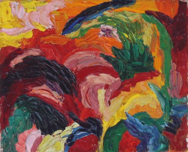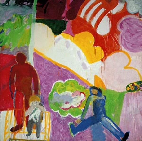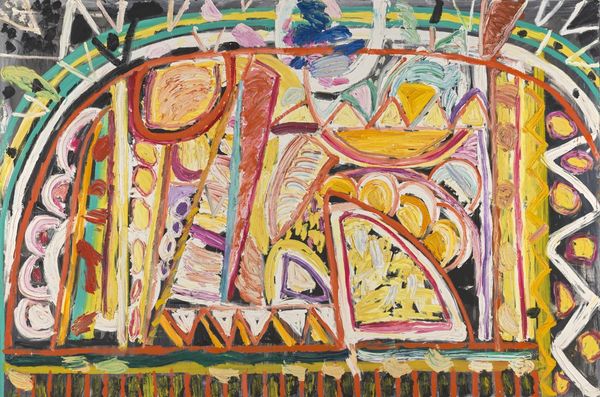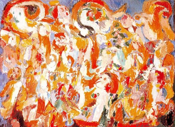 Curator: Look at this vibrant dance of colour, folks. This is "Antony and Cleopatra," painted by Gillian Ayres in 1982. You'll find it here at the Tate Modern. It's a grand splash of acrylic on canvas. Editor: Whoa, chaos! It feels like a visual earthquake happened on the canvas, scattering a whole box of gummy bears! Seriously, the first impression is loud, juicy... maybe a bit much? Curator: Well, Gillian Ayres was very much involved with Colour Field painting and Abstract Expressionism, these movements celebrate the raw energy and emotional power of color itself. The thick impasto application certainly adds to that immediacy. Editor: Immediacy, definitely. It’s almost confrontational, demanding attention. But what's with the title? "Antony and Cleopatra?" Are we supposed to see two doomed lovers in this swirl of oranges and blues? Because frankly, I mostly see breakfast cereal. Curator: The title creates an interesting tension. Ayres often referenced mythology and literature, providing a kind of key, or maybe a playful red herring. It encourages viewers to look for echoes of that tragic love story, perhaps in the intense passion suggested by the colours, or the sense of impending doom hinted by the darker shades. It’s not about direct representation. Editor: So, it's more about the emotional resonance of the story then, influencing her process... Okay, I can dig that. Thinking about Shakespeare, it DOES evoke a sort of lavish, over-the-top, doomed romance kind of feeling. I mean, imagine them drowning in a sea of acrylic paint... tragically beautiful, in a messed-up way! Curator: Precisely! Ayres’s work also fits into a post-war art historical context where pure abstraction becomes a valid subject to be observed in galleries, a shift from conventional academic themes and standards. Editor: It's wild how just throwing paint around can carry so much weight, and context, right? Knowing that helps me engage with this chaos instead of just running away from it. Still thinking about cereal, though. Curator: Art has this magic power, doesn't it, of making a seemingly random canvas into a vessel of human stories. I'm grateful to share my analysis on it. Editor: Agreed. It definitely gives you a whole lot to think about, doesn't it? The beauty is truly there and very powerful!