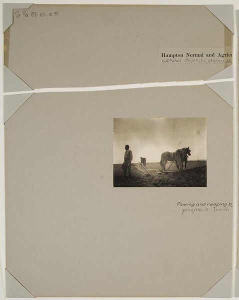 Editor: Here we have a photograph of the Tuskegee Institute Farm in Alabama, taken by Frances Benjamin Johnston. The image shows a group of people working the land with horses. It feels very staged, almost like a demonstration. What strikes you about this piece? Curator: It's a loaded image. The title itself, "Agencies Promoting Assimilation of the Negro," speaks volumes about the socio-political context. This photograph was meant to showcase the Tuskegee Institute's mission of vocational training, but it also reveals the paternalistic attitudes of the time. Editor: So, it's less about the farming and more about the message it's sending? Curator: Exactly. It's about controlling the narrative, presenting a specific vision of Black progress that conformed to white expectations. It prompts us to question whose interests are truly being served. Editor: I hadn’t considered the constructed narrative. It’s unsettling to think about the power dynamics at play here. Curator: Indeed, it's a stark reminder of how images can be tools of social engineering, and a critical lens is always required.