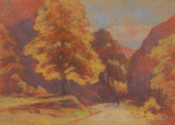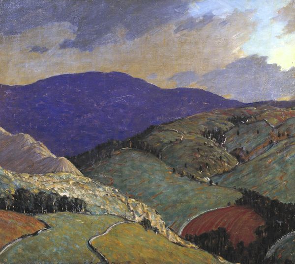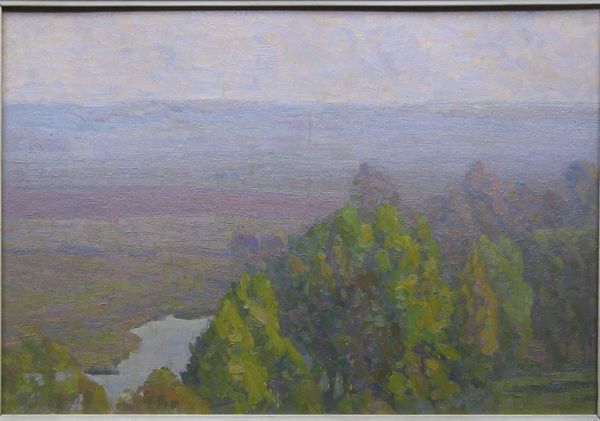 Editor: We’re looking at “Terrace at Marquayrol” by Henri Martin, an oil painting, likely plein-air. The whole thing shimmers – it’s a pointillist landscape. The smokestacks suggest a bustling industry tucked away in this idyllic setting. What strikes you about this piece? Curator: The smoke is key. It's not just atmospheric; it points to the means of production embedded within this landscape. What kind of labour do you imagine sustained that idyllic "terrace"? This wasn't some untouched Eden; the surface and our experience are shaped by materials extracted and refined through the labor of many. Notice how the technique, small dabs of paint, almost camouflages the houses. How might this reflect on class structures of the era? Editor: I see what you mean. The brushstrokes almost blend the houses with the land, but the smoke makes them undeniable. Were these Impressionist painters aware of depicting a working landscape this way? Curator: I'd argue many were deeply conscious of it. Consider the shift from academic painting, with its glorification of elites, to Impressionism's focus on everyday life. But even then, we need to analyze who had the leisure to paint en plein air, and whose labor made it possible. These beautiful textures and colours aren't just aesthetic; they are created from materials bought, transported, and consumed, pointing towards the complex industrial and commercial networks sustaining art creation. Editor: So it’s about understanding the socio-economic factors at play when creating and consuming art. I had not thought about landscape painting in such material terms before. Curator: Exactly! Recognizing art as a product deeply embedded in material conditions offers new pathways into interpreting what we see. Now, does it shift your perception of this terrace? Editor: It does! Now I see the terrace not just as a scene, but as a product of interconnected systems of labour and materials. Curator: And understanding this gives us the vocabulary to interpret it with increased nuance.