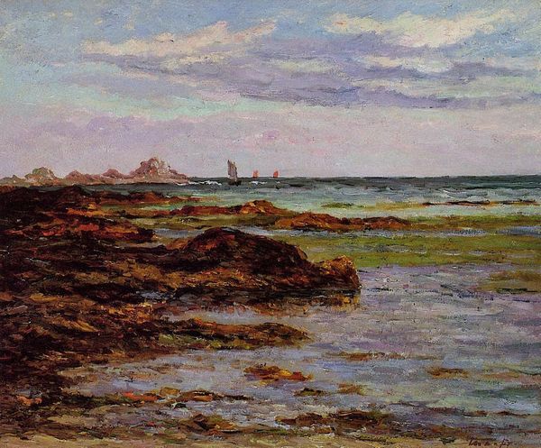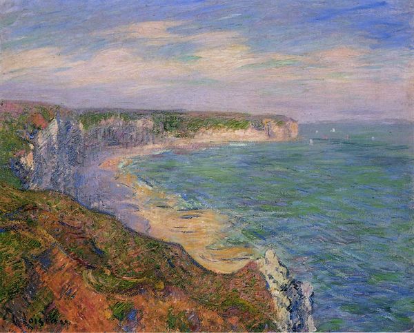 Curator: We’re looking at “By the Sea,” a landscape painting by Gustave Loiseau. Though the artwork's specific date isn't known, the artist worked primarily in the late 19th and early 20th centuries. It is done in the Impressionist style, using oil paints. Editor: It has a calming, contemplative feel to it. The colours, though vibrant, are muted, creating a sense of stillness and reflection. Curator: Loiseau, deeply embedded in the Impressionist movement, painted primarily en plein air. Consider that this artwork encapsulates the fleeting effects of light and atmosphere, cornerstones of the Impressionist aesthetic. His choices in representation of land and sky feel deliberately contemporary; it stands apart from older artistic movements’ ideas about the natural world. What social contexts can we tease out? How does a painter choose to paint land? Editor: Looking at it symbolically, the sea often represents the subconscious, the vast unknown of the human psyche. The cliffs could be interpreted as barriers, the limitations and boundaries that define our experience of the world. Curator: That reading resonates, given that landscapes of this kind often function as allegories for individual consciousness, or sometimes for colonial ambition and claiming land. Impressionism, emerging within distinct economic systems of production, and in specific cultural landscapes, provides an example of an approach that’s intrinsically modern. Loiseau actively grapples with contemporary ideas. Editor: And yet, even with the impressionistic style, certain archetypes remain legible. The clouds overhead hint at something almost divine – perhaps the infinite possibilities life holds. Curator: Absolutely. His mark-making retains associations with the sublime, but here translated for a secular, modern audience navigating a swiftly modernizing Europe. And though “divine” is one avenue, might those clouds also refer to shifts in weather and the rise of climatology as a means of measuring the planet, also influencing an epoch and culture of change? Editor: Perhaps Loiseau intended to bridge these concepts – old with new. It reminds us that our human relationship with nature is complex and that it always carries meaning. Curator: I completely agree. Thank you for sharing those thoughtful perspectives. Editor: A pleasure. This painting definitely invites us to think beyond what we see at first glance.