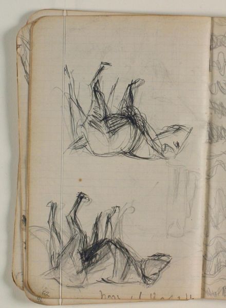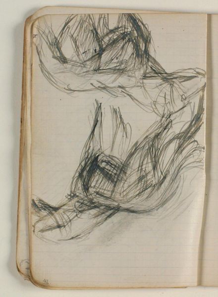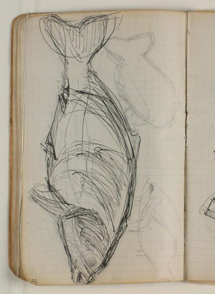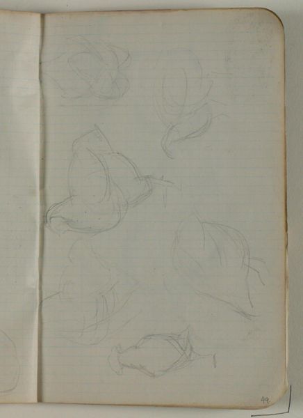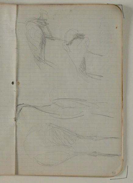 Curator: Niels Larsen Stevns' “Studier af andefugl samt identificerede rids”, or “Studies of Waterfowl and Identified Sketches,” completed between 1905 and 1907. It’s rendered in pencil and graphite on paper, part of the collection at the Statens Museum for Kunst. Editor: It’s surprisingly gestural for sketches – very immediate and free. I like the layering; it suggests movement, or perhaps the artist circling his subject. It almost has an anxious quality. Curator: That urgency speaks to the role of sketching within academic artistic practice at the time. Think of the natural history illustrations so prevalent then; artists sought to understand their subjects intimately through observation and reproduction. It mirrors a wider societal obsession with cataloging the natural world. Editor: Yes, and the somewhat haphazard arrangement makes me think about the sketchbook as a space of freedom, experimentation, outside of more rigid structures, formal presentation... Almost a glimpse behind the scenes of artistic labor? Curator: Precisely. It shows us his process, the repetitions, the search for the right line to capture form and essence. Note how line defines form, almost exclusively; Larsen Stevns reduces the birds to the bare minimum needed to identify them. Editor: And to me, these aren’t just studies of birds, but studies of ways to see, to record. We’re invited to observe not just the subject, but the act of observation itself, which I find so critical when we think of representation. Curator: Right. In the sketches on display here we also glimpse an artistic exploration unfolding—an artist grappling with how to distill complex forms into simplified, evocative representations. Editor: And, as an aside, the sketchbook format is vital – the grid of the page peeks through, framing these seemingly fleeting images and forcing me to read it through the lenses of documentation, data, and control, of course. Curator: A lens that is always critical when analyzing a work such as this. The tension between the formal scientific impulse, and the free artistry found within such work opens some fascinating discussions. Editor: Agreed. This piece really underlines the importance of thinking about art as both a product of its time and a contribution to contemporary dialogues about perception and knowledge.