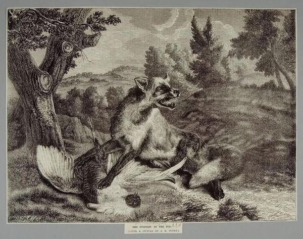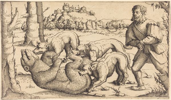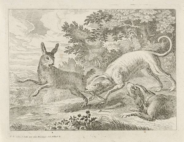 Curator: This is an etching by Francis Barlow, dating from the 17th century, currently held in the Tate collection. It depicts three squirrels in a landscape setting. Editor: It's intriguing. They're almost like caricatures, not just squirrels. There's a hint of theatricality, a narrative being played out. Curator: Barlow was renowned for his depictions of animals, and this piece showcases his skill in rendering them with personality. He secured many commissions from illustrating books, and this print likely served such purpose. Editor: Absolutely. This image speaks volumes about the social attitudes towards the natural world. Are these squirrels observed or are they allegorical figures representing aspects of human behavior? The expressions alone make me question the relationship. Curator: Perhaps Barlow is reflecting a growing interest in natural history, but filtered through human understanding and storytelling. Editor: A fascinating commentary! It makes one reconsider our ingrained assumptions of nature as 'separate' from human society. Curator: Indeed, art often reveals more about us than the subjects themselves. Editor: Precisely, these squirrels offer a mirror to humanity!