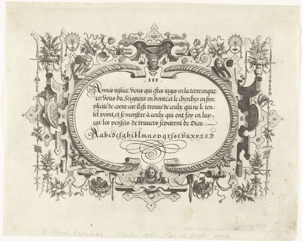 Editor: Here we have "Cartouche met kalligrafie, erboven twee kinderen die hun hoofd steunen," made in 1569 by Johannes or Lucas van Doetechum. It's an engraving in ink. The ornate detail feels almost overwhelming at first glance. What's your take on it? Curator: This engraving provides a fascinating glimpse into the intersection of art, pedagogy, and societal values of the late 16th century. We see calligraphy, but the inclusion of children resting their heads above suggests a contemplative aspect, perhaps tied to learning and intellectual development, a central theme within the Dutch Republic. How does that tension strike you – this idea of instruction being framed by reflection? Editor: I see what you mean! The cherubic figures contrast with the rigid text. So, this isn't just about beautiful writing; it's saying something about education. Is there a particular audience it was aimed at? Curator: Precisely! Consider who would commission such a piece: wealthy merchants or patrician families concerned with civic virtue, humanism, and, naturally, the appearance of being erudite. These display pieces asserted the family’s claim to social status, demonstrating its embrace of education and refined culture. Who had access to this visual rhetoric and why? Editor: Ah, it was meant to impress. So, it's not just art; it’s a statement. It's interesting to think about who it excludes, too. Curator: Exactly! Visual culture always operates this way. Considering that shifts our view of it entirely. What do you make of the animals placed amongst the figures surrounding the letters? Editor: I didn't even notice the animals until now! I wonder if they are supposed to tie back to old world mythology or common allegorical representations. The composition isn't something I originally was focusing on, but its complexities really make me rethink it. Curator: Indeed, details such as these remind us of how carefully constructed and mediated images have always been. It gives you a different understanding and feeling for the artwork, doesn't it?