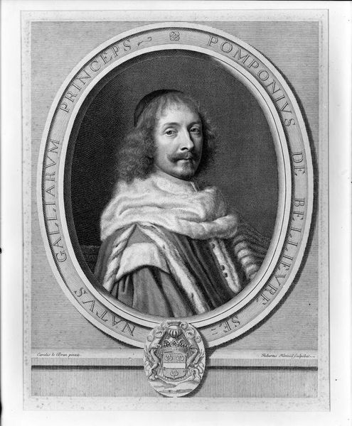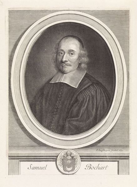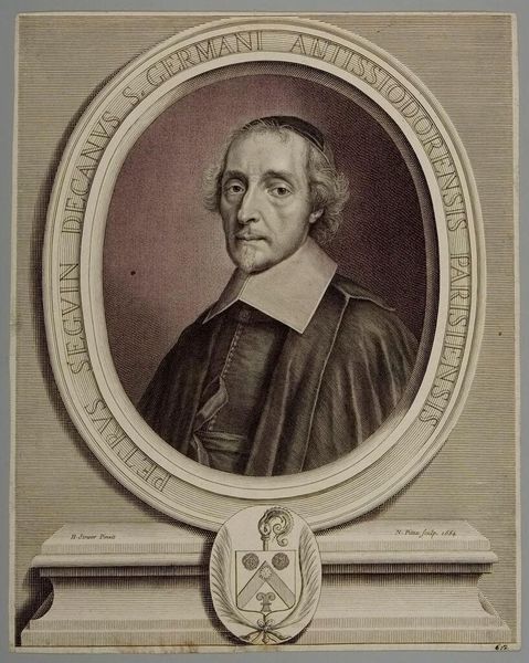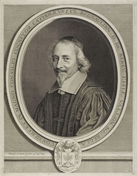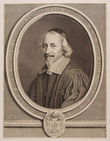 Editor: This is a portrait of Claude Regnauldin by Robert Nanteuil, from the Harvard Art Museums. It looks like an etching or engraving, right? It gives off a very formal, almost austere vibe. What do you see in this piece? Curator: Ah, Nanteuil! His portraits have such a wonderful precision. For me, this isn’t just a likeness, but a capture of Regnauldin's essence, almost a psychological study. Notice the lines around his eyes, the slight smirk – do you think it hints at his personality? Editor: Maybe a little bit? I hadn't really noticed the smirk before. Curator: Exactly! It's those subtle details that transform it from a mere record into a work of art. It makes you wonder about his life, his thoughts. It certainly makes me wonder. Editor: I see what you mean. I was just reading it at face value! Curator: I bet. Always go deeper when you have the chance.