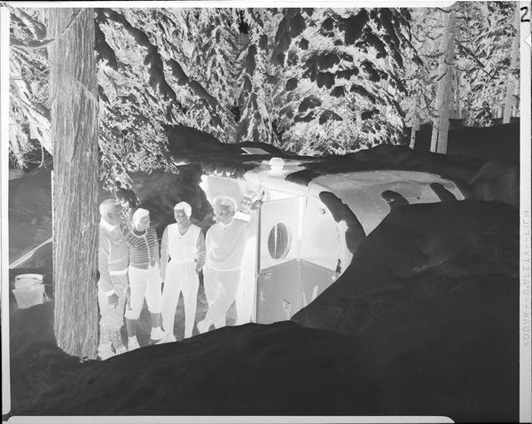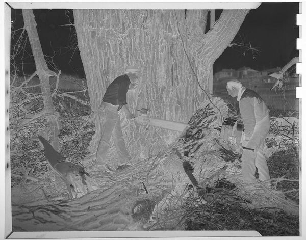 Curator: This photograph by Ken Whitmire Associates is called “Untitled (man and woman in snowed-in trailer)." It's held in the Harvard Art Museums. My first thought is…claustrophobia. Editor: Absolutely. And that’s amplified, I think, by the broader socioeconomic context here. Look at this image, the man shoveling, the woman standing by the trailer. It speaks to themes of isolation, class, and resilience, doesn’t it? Curator: You put into words what I felt. It is so stark. They’re completely surrounded by this imposing landscape, almost swallowed by it. There is such starkness and labor. Editor: This is the visual vocabulary of survival. These details offer a quiet, persistent commentary on the human condition and its relationship to the environment. Curator: It’s a reminder that we’re all, in a way, digging ourselves out of something. Editor: Indeed. It urges us to reflect on whose labor remains invisible and the structures that keep them there.