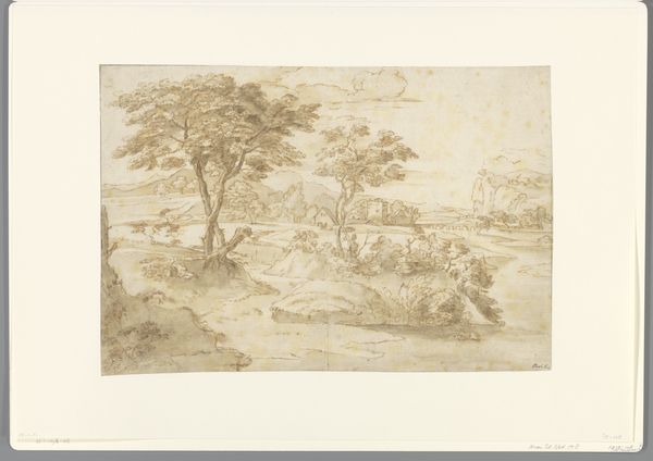 This landscape with figures, undated, is a drawing in pen and brown ink by an anonymous artist. The composition, almost entirely in sepia tones, creates a densely layered scene. Notice how the intricate network of lines forms an encompassing canopy of trees that frames a distant landscape. The artist has used line and shading to define forms, but also to create a sense of depth and atmosphere. Consider the semiotic implications of the trees, which do more than just frame. They invite us to consider the tension between the wild and the cultivated. Are we looking at a literal forest, or is it a metaphor for the complex structures of society? The figures, arranged in what appears to be a moment of rest, are set against a carefully constructed backdrop. The drawing prompts us to question the relationship between humanity and nature. Its formal qualities are not merely aesthetic choices but are integral to its broader cultural and philosophical implications. The drawing's meaning remains open, inviting continuous re-evaluation.