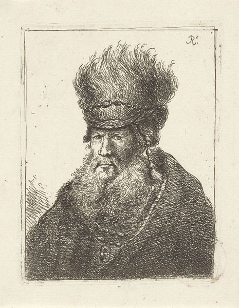 Editor: Here we have Rembrandt's "Bust of a Man Wearing a High Cap," an etching. The detail achieved with simple lines is amazing. What strikes you most about the materials and process used here? Curator: Note how Rembrandt utilizes etching, a process of corrosive material transformation, to depict a figure adorned in what appears to be luxurious fabric. How does the "high" cap signify social standing, and what is the role of labor in acquiring these materials? Editor: So, you're saying the clothing materials point to a system of production and consumption? Curator: Precisely. Consider the artist's labor, too. Etching involved skilled craftsmanship and time. How does this process elevate or challenge traditional notions of artistic production and value? Editor: I never considered the social implications of etching before. Thanks for the insight! Curator: It makes you consider what is produced, by whom, and for whom. Food for thought.