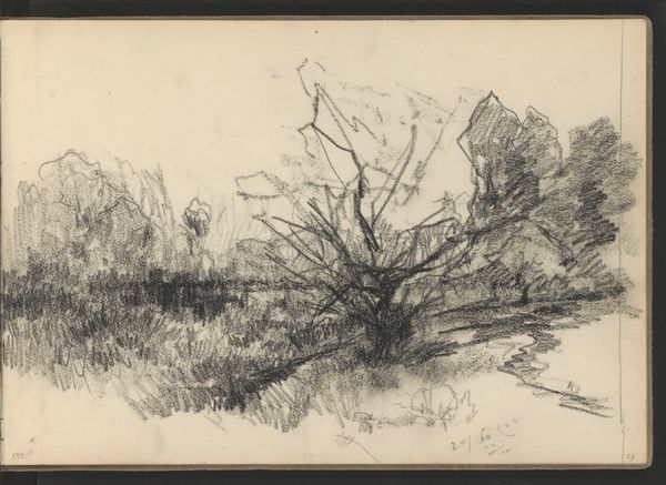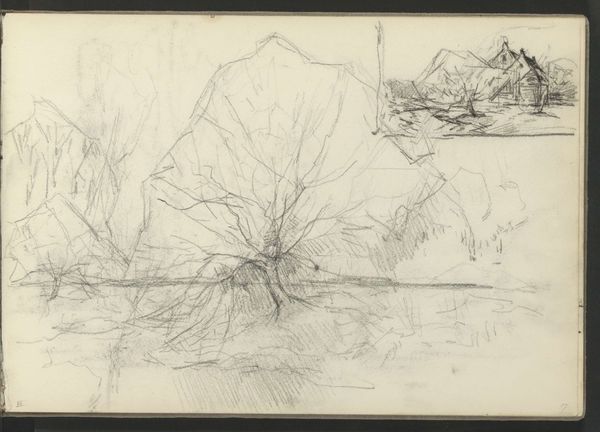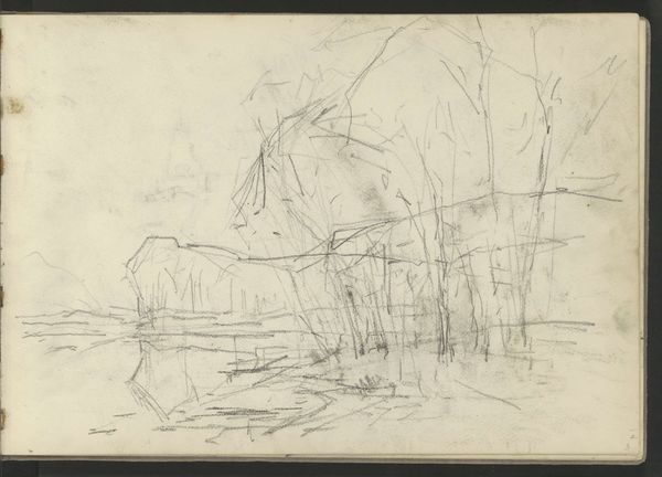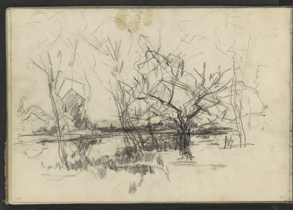 Editor: Here we have "Landscape with Trees and Water," a drawing in pencil and ink by Egbert Rubertus Derk Schaap, from around 1891. It’s… quite minimal, really. Sort of an echo of a landscape. What strikes you most about this piece? Curator: An echo, yes! I love that. It feels like peering into a memory, doesn’t it? Those delicate lines sketching the trees and the shimmer of water… It’s less about precise representation and more about capturing a fleeting impression. Look how the trees on the right are rendered so loosely. What feeling does that evoke in you? Editor: Definitely a feeling of transience. It's interesting that you call it a memory because I feel as if I can only glimpse this place for a split second. Was this a common approach for landscape artists at the time? Curator: Absolutely. Late 19th-century artists were increasingly interested in capturing subjective experiences. Forget those grand, panoramic landscapes meant to impress. Artists like Schaap started focusing on intimacy, personal connection with nature, the here and now. There's something vulnerable, and even radical, in its understatement. What do you think that restraint communicates? Editor: I think the lack of detail creates a sense of universality, strangely. It's almost as if Schaap wants the viewer to bring their own memories and associations to the scene. Like a fill-in-the-blanks exercise for the imagination. Curator: Beautifully said. It invites us to slow down, to contemplate, to find the poetry in the ordinary. So, does it change your initial impression, knowing this? Editor: Completely. It's become so much richer. Now I’m noticing how those seemingly simple lines carry such a wealth of emotional and historical weight! Curator: Precisely! That’s the joy of digging deeper. There's always more than meets the eye.