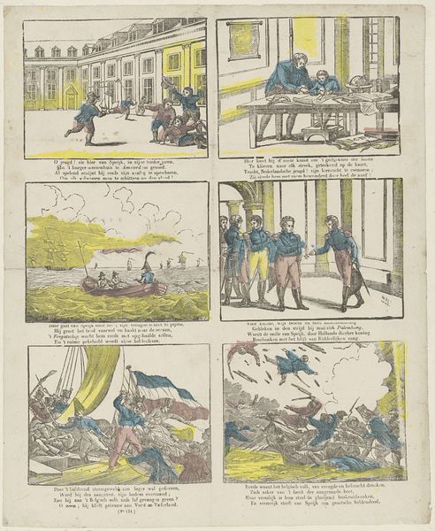 This print, titled *Willem Tell,* was made by P.J. Delhuvenne, using etching with hand-applied color. Etching is an indirect process that involves applying a protective wax layer to a metal plate, scratching an image into the wax, and then bathing the plate in acid. The acid bites into the exposed metal, creating incised lines that hold ink. Here, the etched lines define the figures and landscape, while the hand coloring adds depth. The labor-intensive process of etching, followed by the hand-application of color, speaks to the print's original context. Before industrial printing, images like this were painstakingly produced, and consequently, relatively precious. The use of this traditional craft method gives *Willem Tell* a sense of historical weight, connecting it to older forms of storytelling, before the age of mass media. This intricate combination of craft and storytelling reminds us that even seemingly simple images can have a rich and complex material history, challenging our assumptions about art and its relationship to labor.