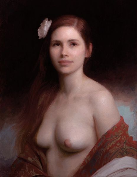 Adrian Gottlieb painted ‘Cassandra’ using traditional oil paints, a process that invites us to consider the labor involved. Notice the smooth gradations of color across the figure's skin, achieved through a meticulous layering of translucent glazes. This is a time-intensive process. Each layer of paint must be allowed to dry before the next is applied, a slow build-up that gives the painting its luminous quality. There is a traditional, Renaissance-like quality to this portrait, which can sometimes obscure the amount of technical skill and patience required to complete it. While the finished painting may seem effortless, the process is rooted in the artist's practice. In today's society, where we are used to instant gratification and mass production, appreciating the work involved becomes an important form of critique. It encourages us to question the value we place on human skill and effort, and the role of art in reflecting these values.