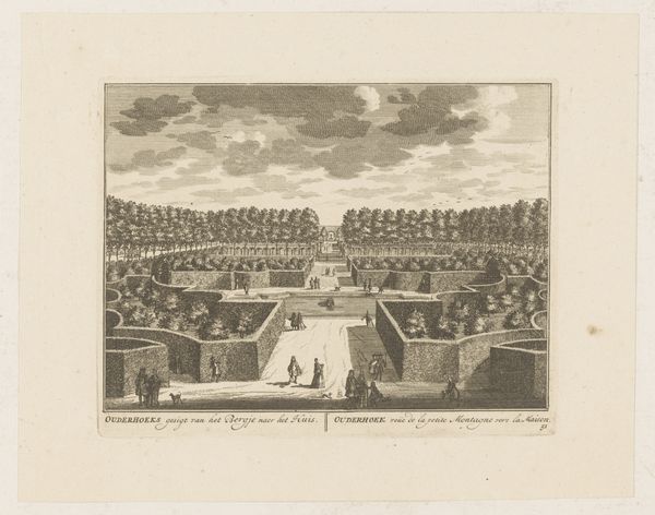 Curator: Here we have an engraving titled *Fireworks display, Nuremberg, 1659,* rendered in 1673 by an anonymous artist, currently housed in the Metropolitan Museum of Art. The medium appears to be primarily ink on paper. What are your initial impressions? Editor: Well, the level of detail achieved with simple lines is quite striking, even if the perspective seems a bit... unusual to modern eyes. There's an almost dreamlike quality to this city on display. The figures are posed rather stiffly, don't you think? Curator: Indeed. The stylized rendering underscores the artificiality of the scene itself, reinforcing the intended message of control and grandeur. Consider the relationship between the figures in the foreground and the performance taking place within the arena. It operates structurally as an allegory of imperial power and performance. Editor: That resonates, but I can't help thinking about the craftsman laboriously etching these lines. Consider the sheer amount of work required to replicate this across multiple prints and the function it then served for documenting such lavish displays of Imperial Power and resources. Think, too, of how the spectacle was constructed in real life, the manpower and materials. Curator: A valid point. There’s also a deeper semantic layer at work. The symbolic implications of light overcoming darkness during the firework display mirror Leopold's triumph. We can parse this Baroque tendency towards allegory by decoding it with the visual elements in this particular spatial configuration. Editor: I'm more concerned about the implications and conditions of production – think of the workshops, apprentices, and materials involved in staging that original firework performance, and the socioeconomic structures it was intended to showcase and reinforce! It seems a significant amount of time and energy was expended to emphasize power, position, and the social status quo. Curator: An engaging socio-political reading. I find myself drawn, finally, to the overall visual impact. The combination of the figures and landscape creates a unified effect. Editor: I appreciate knowing how deeply intertwined art and labor were and continue to be in manufacturing such impactful pieces.