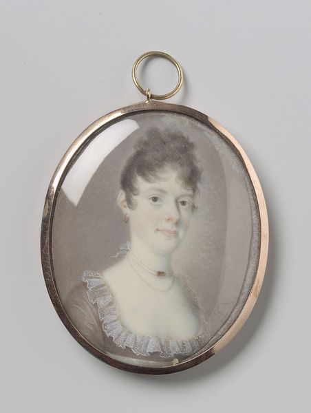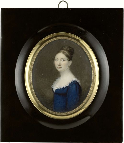 Curator: This is a watercolor portrait miniature of Mrs. Nathaniel Bowen, born Margaret Blake. Painted circa 1802-1805 by Jean Francois de la Vallee. Editor: It possesses a delicate quality, doesn't it? The small scale imbues it with an aura of intimacy, a captured moment preserved within its circular frame. Curator: Precisely. Let’s examine the formal elements. The artist’s use of watercolor achieves a subtle luminosity, particularly in rendering Mrs. Bowen’s complexion. Note how the oval format directs the viewer's eye to the figure, contained within the frame. Editor: And contained in her social role, one might say. The details, from her attire to the way her hair is arranged, speak of a particular class and status within early 19th-century society. It evokes a powerful sense of domesticity, wouldn't you agree? There's a serenity, a sense of ordered life, but also a possible undercurrent of constraints dictated by societal expectation. The gaze seems to ask something, I'm unsure of what. Curator: The formal arrangement lends itself to that interpretation. Observe the positioning of her body; she's presented frontally, yet there's a slight turn of the head, breaking from complete symmetry. It provides a visual dynamism, inviting scrutiny of the facial expression. It certainly plays to a study of portraiture as practiced in Academic circles at this time. Editor: Speaking of the face, what interpretations could arise when observing that particular look in her eyes? I wonder about the power these objects, especially portrait miniatures, once possessed—functioning as keepsakes, surrogates for loved ones separated by distance or death. Curator: Indeed, they were imbued with enormous personal significance. Now, consider the broader art historical context. It reflects a prevailing trend toward Romanticism, evidenced not so much in the dramatic rendering as in the heightened emotional intimacy that portraitists explored during that period. There are few historical breadcrumbs to observe, sadly, which is too often the case for artwork that depicts women from that time period. Editor: A glimpse into a world, meticulously crafted and preserved. So, in closing, what can one glean from a simple observation of this work? Curator: It's a testament to the artist's technical skill and ability to encapsulate not only physical likeness, but also hints of individual identity within the constraints of social convention. Editor: I leave intrigued by how it reminds me that objects, particularly portrait miniatures, often carry emotional weight and resonate beyond the visual, speaking volumes about both the sitter and their era.