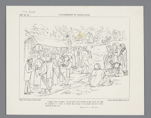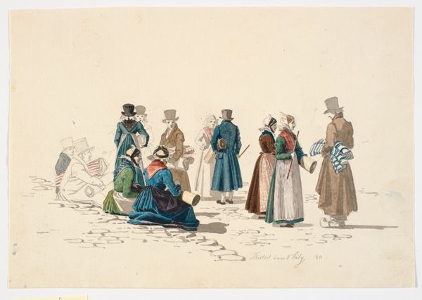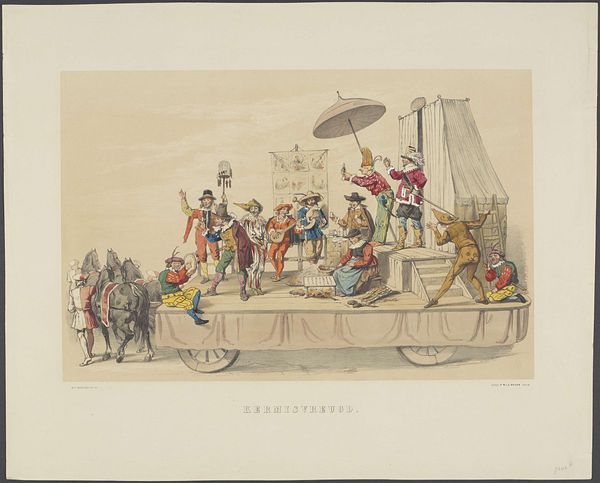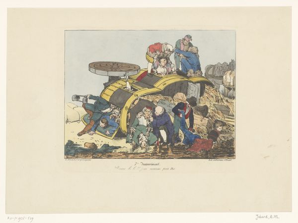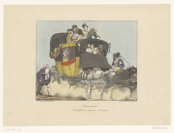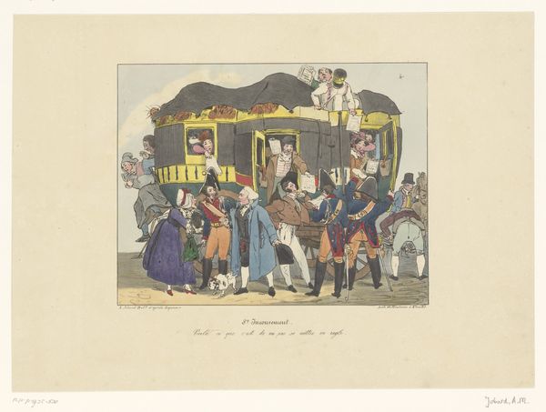 Editor: So, this is "Douaniers inspecteren bezittingen van passagiers," or "Customs officers inspect passengers' belongings," created by Joseph Ambroise Jobard after 1826. It’s a watercolor lithograph, and what strikes me is how it depicts this whole messy process of inspection. What do you make of it? Curator: I see a fascinating commentary on the material culture and its control during this period. The lithograph, a relatively new and reproducible medium, serves as an apt vehicle for depicting the mundane, yet critical, act of inspecting goods. Notice how Jobard meticulously renders the objects being examined – fabrics, packages, personal belongings. Editor: Right! It almost feels like he's cataloging what people were carrying around back then. Curator: Exactly. The print becomes a record of consumer goods and their movement. What’s also interesting is to consider the labor involved – not only of the customs officers but also in the production of all these goods. Where were these items made, by whom, and how did their materials shape social relationships? Editor: So, you’re suggesting it’s less about the caricature of the people and more about the objects and what they represent in terms of trade and social structure? Curator: Precisely. The “genre painting” aspect gives insight into the power dynamics inherent in customs inspections – the state’s intervention in individual lives and economies. Who had to undergo inspection and why? Who benefitted and who lost? Think about those questions. Editor: It’s amazing how a seemingly simple image can reveal so much about material history. Curator: And the method of reproduction itself makes it widely accessible and consumed; this act itself becomes part of that network. Jobard used materials to showcase how they shaped society, economy, and lives. I’m constantly rethinking where craft and consumption merge. Editor: I'll never look at a simple illustration the same way again! Thank you.