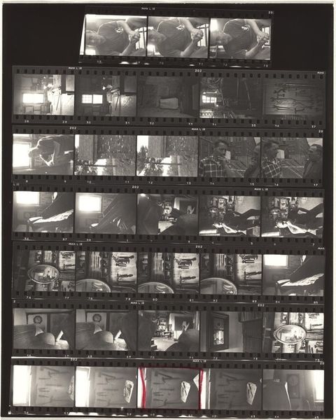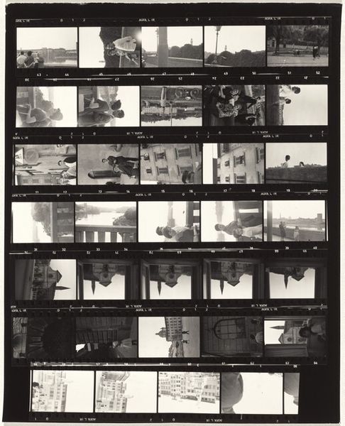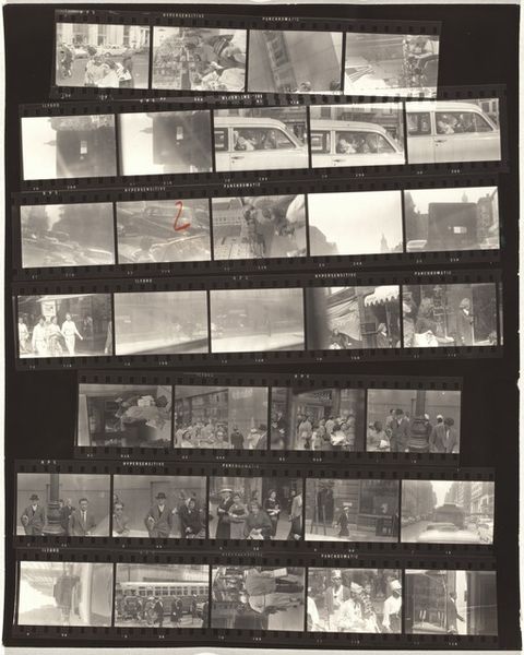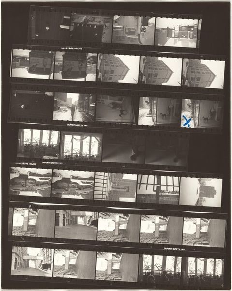Editor: So, this is "New York City 2" by Robert Frank, taken sometime between 1957 and 1958. It's a strip of black and white 35mm film, with a series of candid shots. The mood seems kind of gritty, like a snapshot of everyday life. What do you see in this piece? Curator: I see a layered narrative about postwar America, especially its complex relationship with national identity. Frank, a Swiss immigrant, offers an outsider's perspective, challenging the idealized images of the American Dream often presented in mainstream media. Editor: How so? The images are hard to decipher in places. Curator: Precisely. The blurred, sometimes obscured, quality of the images disrupts the clean, easily digestible narratives we're accustomed to. For example, notice the stark contrast between the patriotic imagery in some frames and the apparent emptiness in others. What does that juxtaposition suggest to you? Editor: It feels almost cynical, like he's questioning the gap between the ideal and the reality. Especially the shots that appear inside a vehicle... is he separated from the city somehow? Curator: That's a crucial observation! He is both physically present and symbolically distanced. The car becomes a liminal space, a metaphor for his position as an observer, never fully integrated, always slightly removed. This allows Frank to critically examine issues of race, class, and consumerism that were often glossed over during that period. Editor: It's interesting how a simple strip of film can be so loaded with meaning. I definitely didn't see all of that at first glance. Curator: Art invites us to dig deeper. Frank's work reminds us that seemingly candid images can be powerful critiques of the society that produces them. Editor: This really encourages a more critical lens for interpreting even seemingly simple documentary photos. Curator: Absolutely. It encourages us to question whose story is being told and how.
