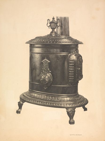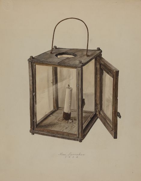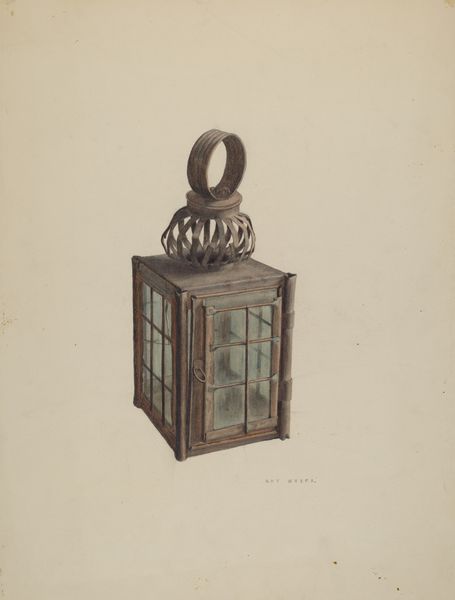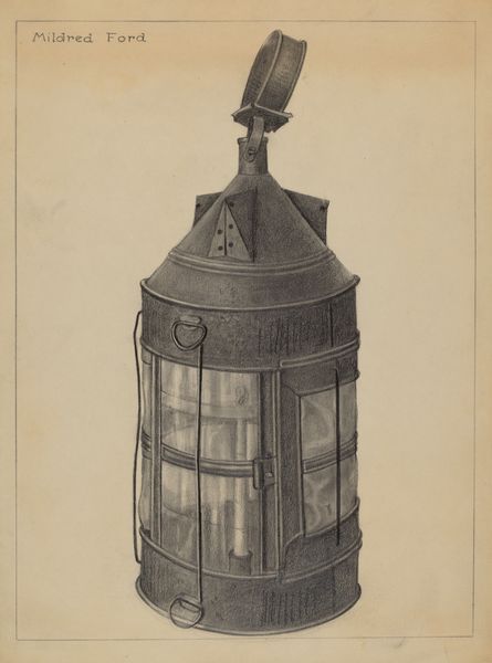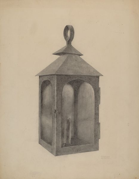 Curator: We’re looking at Henry Granet’s drawing "Lantern for Candle," likely created between 1935 and 1942. It's rendered in pencil. Editor: The first thing that strikes me is its starkness, almost severe. The precise rendering of this utilitarian object elevates it. What I find especially intriguing is the handling of light and shadow despite its execution in monochrome, almost mimicking the subtle glow emanating from a real candle lantern. Curator: Indeed, it's fascinating how Granet imbued such a simple object with such significance. These lanterns were common tools for laborers. Consider the socio-economic implications, especially during the period he made this, during the Great Depression. A source of light represented sustenance for some people. Editor: Good point. I also see it as a study in form. Look at the rectangular cage softened by the cylindrical top and arched handle. The linear bars create a visual rhythm that encloses what appears to be a solitary candle stub. The composition balances geometric shapes with a subdued tone. Curator: Absolutely. Granet may also be engaging in a larger dialogue about craft. With increasing industrialization, handmade lanterns evoke ideas about a bygone era where things are created more slowly, perhaps invoking an argument about the ethics of different labor forms. Editor: The artist seems captivated by the geometric harmony. It's almost a celebration of utility, elevating something so functional to an object of beauty. And I can’t ignore how, using a single pencil, Granet coaxes a feeling of volume. Look at the upper section, a type of crowning structure atop the primary form of the lantern, complete with delicately shaded ventilation holes. Curator: That's very well observed! Understanding the socio-historical conditions under which it was made and displayed invites reflection on what it meant to depict working-class imagery. The lantern serves as a quiet testament to endurance through those challenging years. Editor: For me, I walk away with a new appreciation for line and form through this seemingly humble image. Curator: And I appreciate how studying this piece lets us consider everyday laborers and the meanings we may extract from that memory.