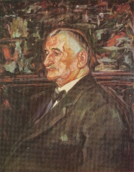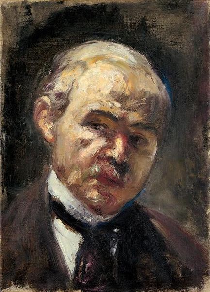 Editor: This is Amedeo Modigliani's "Joseph Levi" from 1910, an oil painting portrait currently residing in a private collection. The way the face is rendered, especially the eyes, creates a somewhat stern and intense feeling for me. What symbols or meanings do you see within this painting? Curator: It is interesting you observe that feeling right away. Let’s look at it through a cultural lens. Note the subject's severe gaze. Notice how Modigliani uses color—dark tones against muted skin. Doesn’t it give an impression of someone with a lot of authority, maybe even someone in the establishment? Editor: Yes, now that you mention it, I see that sternness amplified in the upward-tilted gaze and slightly pursed lips, conveying a quiet disapproval. Curator: The painting appears to signify not merely an individual but a representation of societal power structures. I’m intrigued by how Modigliani has balanced representing an individual with communicating societal impressions. What do you suppose the placement of that small medallion communicates? Editor: I think the gold medallion adds to that feeling of power – like an award or honour the man received in society. A mark of achievement or belonging to an elite group, maybe. It's like Modigliani is saying something about societal validation. Curator: Precisely! It serves as a symbol, doesn't it? A visible emblem encoding ideas about success and value. A symbolic accent amplifying cultural narratives through portraiture. What are your thoughts? Editor: Seeing this painting through its symbolic weight changes my perspective completely. I had seen just an old portrait before, but I understand it is much more. Thanks. Curator: The painting evolves with closer inspection! Each element contributing layers of historical and symbolic resonance.
