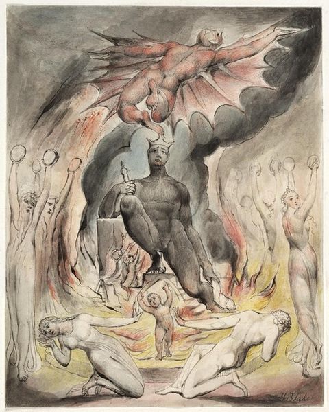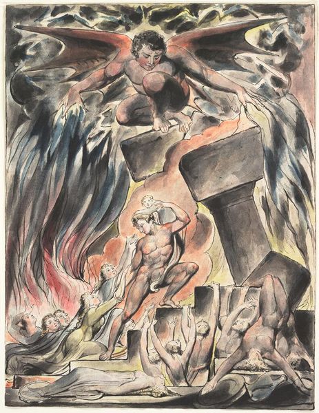 Curator: This is William Blake's "Illustration to Dante's Divine Comedy, Hell," a work rendered in ink and watercolor on paper. Its creation aligns with Blake's lifelong project of illustrating major literary works. Editor: My immediate impression is one of layered suffering. The watercolor is so translucent it gives an ethereal quality, yet the figures are caught in what looks like a visually oppressive, multi-tiered space. The symbolism is quite overwhelming. Curator: Absolutely. The socio-political contexts of Blake's era, including revolutions and stark class divisions, profoundly shaped his reading of Dante. He reimagines hell not just as a place of eternal damnation, but as reflective of earthly injustices and spiritual imprisonment. This drawing exemplifies his visual rebellion against Enlightenment rationalism. Editor: Looking closely at the composition, there is this tiered structure where one scene blends almost seamlessly into the next through skillful lines. Look how the figures, especially the suffering souls, are elongated, distorted, almost like their forms themselves reflect spiritual anguish. Curator: Exactly. Think of Blake as someone intensely engaged with challenging dominant theological perspectives of the time. His "Hell" becomes a commentary on abuses of power, religious hypocrisy, and the individual's struggle against oppressive systems. We might even see a radical empathy extended toward those society marginalizes and condemns. Editor: Yes, the flowing lines give a certain grace to even the tormented figures. I see echoes of Michelangelo in the muscularity but a wholly original expressionistic use of anatomy to show pain. Notice the contrast in the upper section – that radiant color, even within such a tragic scene, lends a strange beauty. Curator: Blake, like many Romantic artists, found ways to express humanity, rebellion, and hope, even amidst depictions of despair and spiritual darkness. It makes this "Hell" profoundly engaging beyond simple allegory. Editor: It’s a reminder that close attention to composition and color reveals powerful formal choices, adding so much emotional resonance to what might at first seem merely narrative. Curator: For me, this illustration embodies how art can be both a critique of its own time and a space for re-imagining possibilities for radical societal change. Editor: And a testimony to the timeless power of artistic technique to evoke emotion.