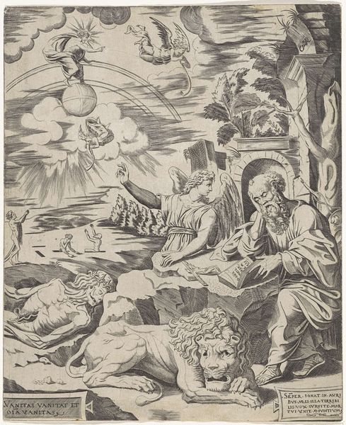 Curator: What a dramatic piece. My initial reaction is a feeling of turbulent energy. It's chaotic yet purposeful, filled with contrasting figures and elements. Editor: Yes, it's certainly dynamic. We're looking at "The Birth of Bacchus" by Pieter Serwouters, created sometime between 1616 and 1657. It’s an engraving held here at the Rijksmuseum. The sharp lines convey incredible movement. My eye is drawn to how the fire seems almost palpable, yet it’s rendered simply through the skillful manipulation of lines and varying tonal values. Curator: The myth itself is charged with questions of legitimacy and divine power. Semele, consumed by divine fire, tricked by Hera, gives birth prematurely to Bacchus. Zeus rescues the infant, sewing him into his thigh until he’s ready to be born again. It challenges normative power structures. It raises ideas about patriarchal systems absorbing and rewriting female experiences for their own perpetuation. Editor: Absolutely. The physicality of that act—Zeus carrying Bacchus and essentially gestating him—points to the extraordinary effort, or even labour, involved in claiming Bacchus. It makes me think about the reproductive labor of the Gods, their power to physically transform matter into the living form we see here. Notice the detail in Zeus's garment and crown compared to Semele and the surrounding figures; such a visual distinction speaks to an uneven social and labor landscape between genders and classes. Curator: Precisely. The composition, with Semele collapsing amidst the flames and Zeus ascending, safe and strong, is deeply symbolic. The themes touch on immortality, resurrection, but I am struck by this theme of the patriarchal reclamation of a specifically female generative power. What could the fire itself signify? Is it a purifying force, a destructive one, or both? Editor: Fire's dual symbolism really adds depth here. As a craftsperson, I am fascinated by the technical prowess displayed through this etching; turning such a chaotic subject with its flames, smoke and fury into organized pen strokes makes the artist into Zeus and his Godly peers manipulating raw materials in real time, too. Curator: This engraving offers a glimpse into the intersection of mythology, gender, and power dynamics of the 17th century. It reminds us to look beyond the surface narratives and examine the societal structures that shaped the creation and interpretation of this, and so many other, artistic achievements. Editor: Ultimately, looking closely at the raw physical and mythological elements within art and life allow us to understand larger cultural narratives about societal values. And in some instances create a space to dismantle that framework, spark dialogue, and construct new understandings and visions for tomorrow.