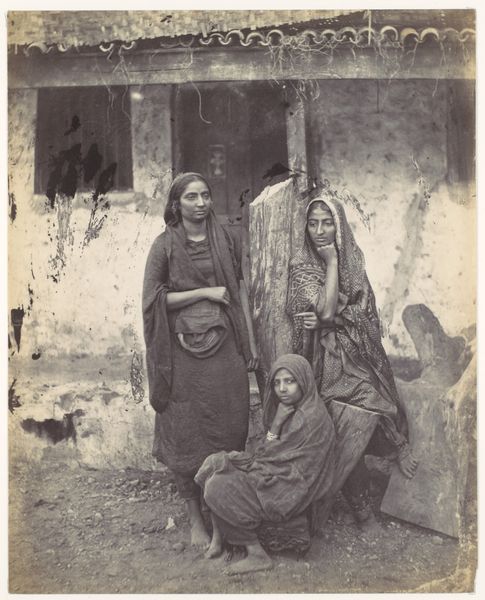 Editor: This photograph, taken in Java between 1880 and 1905 by Kassian Céphas, depicts a dance performance. It shows a dancer with musicians in what seems to be a staged setting. I'm struck by the direct gaze of the dancer. What do you see when you look at this image? Curator: Immediately, I notice the constructed nature of this image, hinting at deeper cultural layers. The backdrop depicting the exotic 'outdoors' contrasted with the woven screen suggests the constructed image. The Ronggeng dance itself is highly symbolic, isn't it? A ritual, almost a dialogue between the dancer and the musicians and onlookers, each symbol carries immense cultural weight. Look at the dancer's attire, its colors and patterns. What do those evoke for you? Editor: I hadn’t considered it so staged initially. The attire does seem carefully considered, perhaps indicating status, or a specific narrative within the dance. Is it about a conversation, then, more than mere entertainment? Curator: Exactly! Consider also how the musicians surround and support the dancer, both physically and symbolically. The gamelan music is crucial—it's not merely accompaniment but an integral part of the dance's narrative. And look closer – are they posed, or are they truly in movement and interaction? What does it tell us about how cultural identity was presented, and even perhaps consumed, during that era? It is photography so its documentary character makes it seem candid when really its not, and probably very posed. Editor: I now see the image as deliberately constructed. The staging, the attire, it all suggests a conscious performance for the camera. Curator: Precisely. These photographic symbols invite us to contemplate the layers of performance and identity present in Javanese culture and photographic symbolism in general. We come to understand visuality, symbolism and identity more closely in photographs, not necessarily so directly observable or obvious in, say, painted portraits. Editor: It’s fascinating how much can be unpacked from a single image. Thanks to your insight, I've gained a much deeper understanding of its cultural context and hidden meanings.