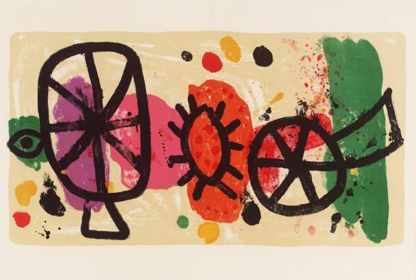 Curator: Alan Davie's "Bird Through Wall," currently held in the Tate Collections, strikes me as bold and playful, with its juxtaposed shapes and vibrant colors. Editor: The lithographic process Davie employed—the layering of these flat, graphic forms—it suggests a very deliberate construction of meaning, wouldn't you agree? Curator: Absolutely. Consider how the arrangement of the Ankh, crescent moon, and geometric forms, are symbolic gestures towards ancient cultures. Davie clearly had an interest in exploring non-Western artistic traditions and spiritual beliefs. Editor: I'm drawn to how Davie blurs the lines between representation and abstraction. The shapes themselves feel almost childlike, yet the composition has a sophisticated, almost mystical quality. Curator: It's this dance between material and message that's so compelling. It speaks to a universal quest for meaning, crafted through mindful labor and material choices. Editor: Indeed, a quest that continues to resonate.
